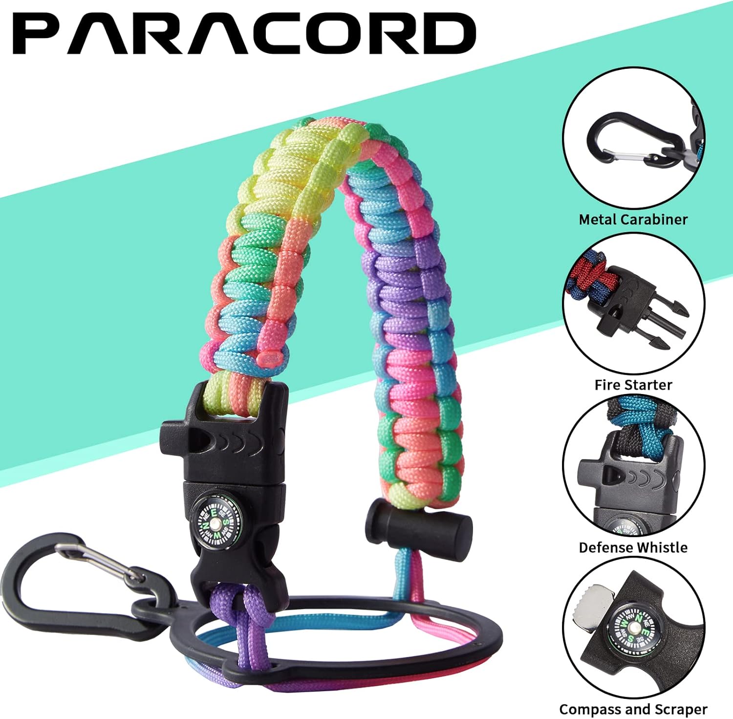 - UNIQUE PARACORD—Perfect Accessories: bright color paracord matches the flask water bottle to give you a youthful vibe while adding a personal style. It comes with a compass, safety loop, metal carabiner, flint, igniter, and whistle to become your survival tool for your wild adventures