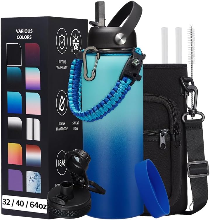 - COMBO—Super Deal: Buy 40oz stainless steel water bottles and get 9 accessories (2 x lids, 1 x survival paracord, 1 x carrying pouch, 1 x shoulder strap, 1 x protective cup mat, 2 x straws, 1 x straw brush). WITH A LIFETIME GUARANTEE, these thermal water bottles are the perfect gift for use at home, work, school, road trips, hiking, sporting events, or just hanging out
