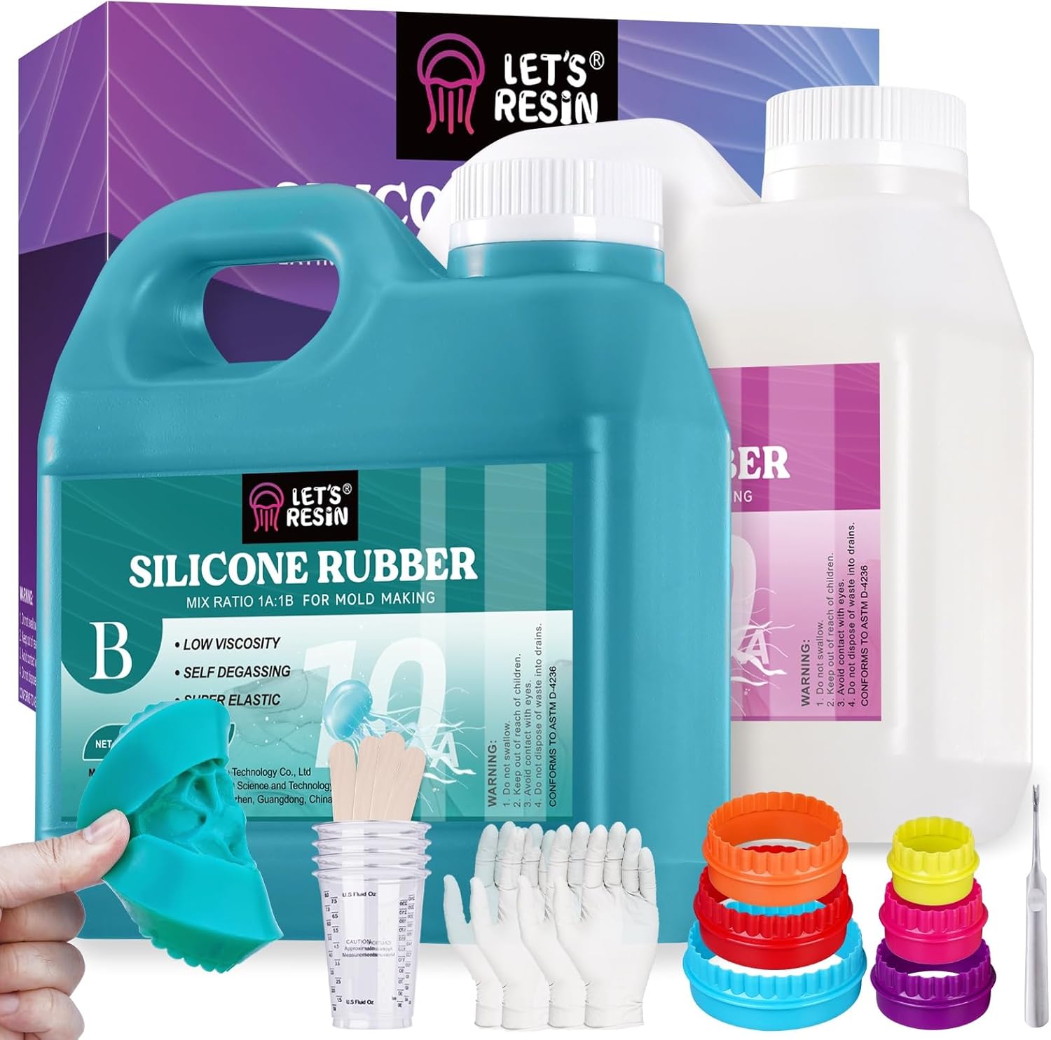 - 【70.5OZ ALL IN ONE MOLD MAKING KIT】: LETS RESIN silicone mold making kit comes with 2 bottles of liquid silicone, each bottle containing 1kg/2.2 lbs of platinum cure silicone which is food grade silicone, as well as 6pcs x different size plastic mold housing; 4 pcs x 8oz plastic mixing cups; 4pcs x wooden mixing sticks; 2 pairs x disposable protective gloves; a perfect silicone mold kit for beginners to try, satisfying your various needs.