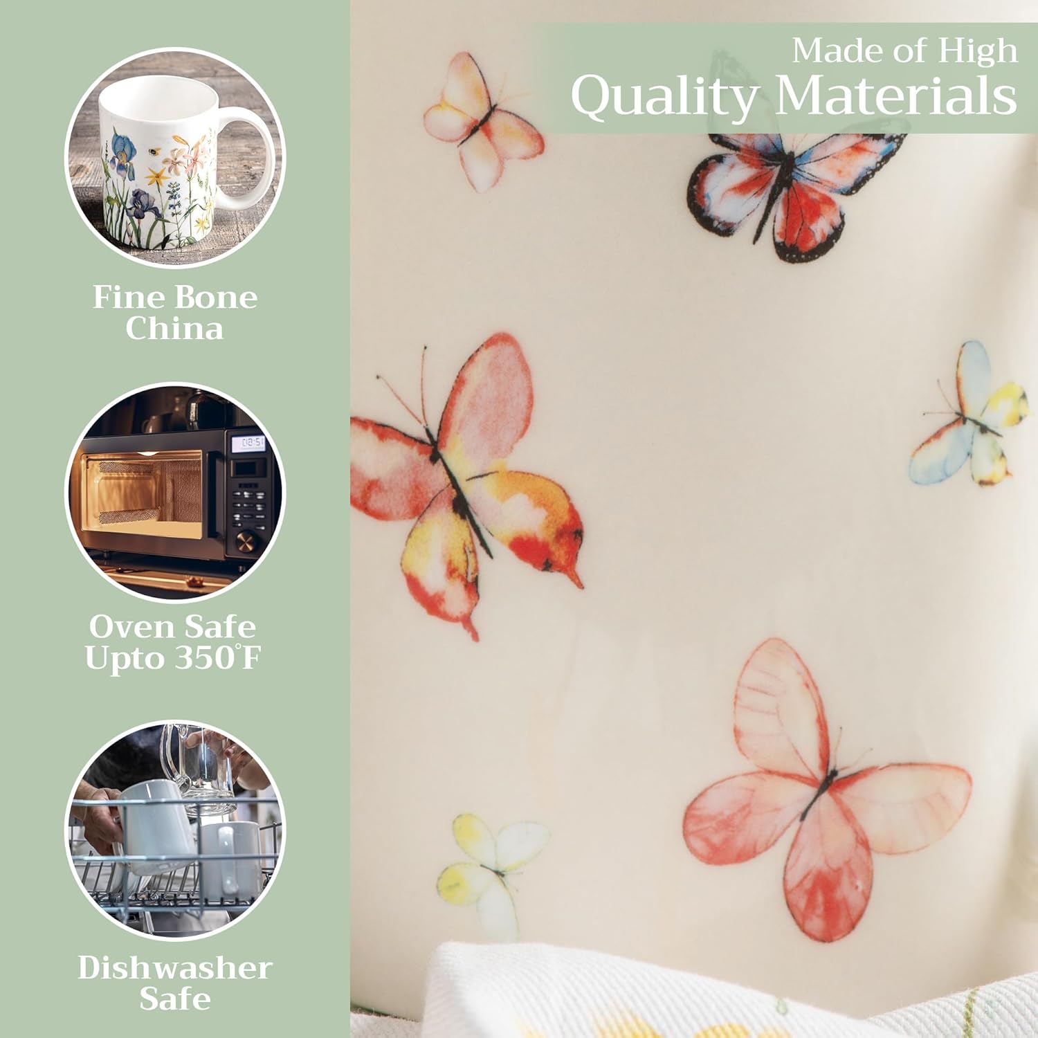 Maison d' Hermine Coffee Mug with Handles Fine Bone China Mugs Pack of One Tea Cups for Hot Beverages Cappuccino Latte Home Restaurant Office Perfect for Gift (Botanical Fresh - Butterflies, 15 Ounce)