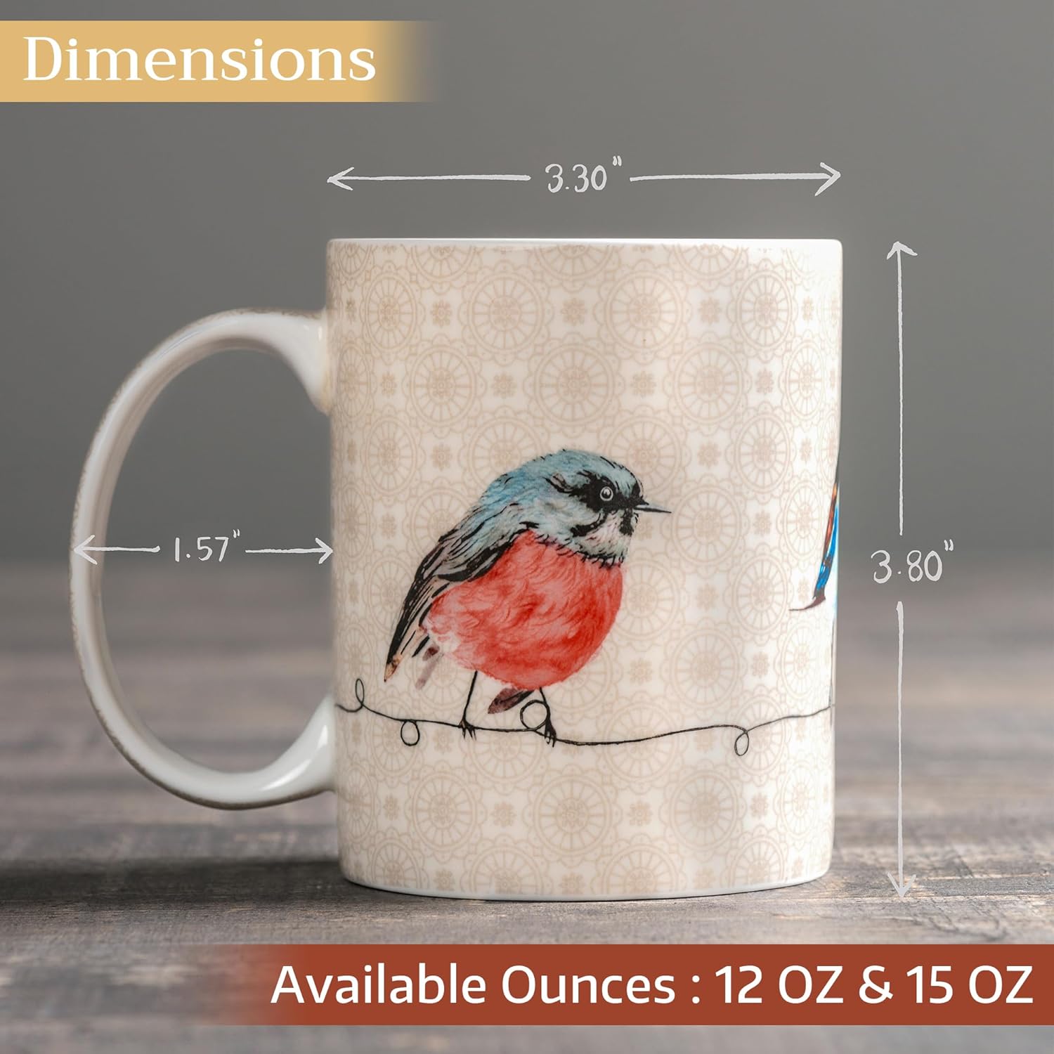 Maison d' Hermine Coffee Mug with Handles Fine Bone China Mugs Pack of Two Tea Cups for Hot Beverages Cappuccino Latte Home Restaurant Office Perfect for Gift (Birdies On Wire, 15 Ounce)