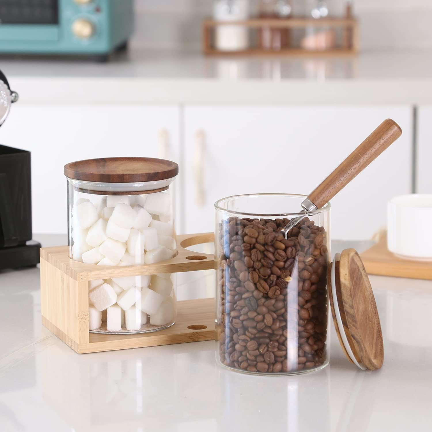 - Complete Set Includes:2 glass sealed jars (Height 5.5'' x Diameter 3.74'',Capacity:25fl oz/750ml),1 wooden handle scoop(1 TBSP) and 1 bamboo rack(10.24'' x 4.5'' x 2.76'' ,L x W x H),Label Stickers.