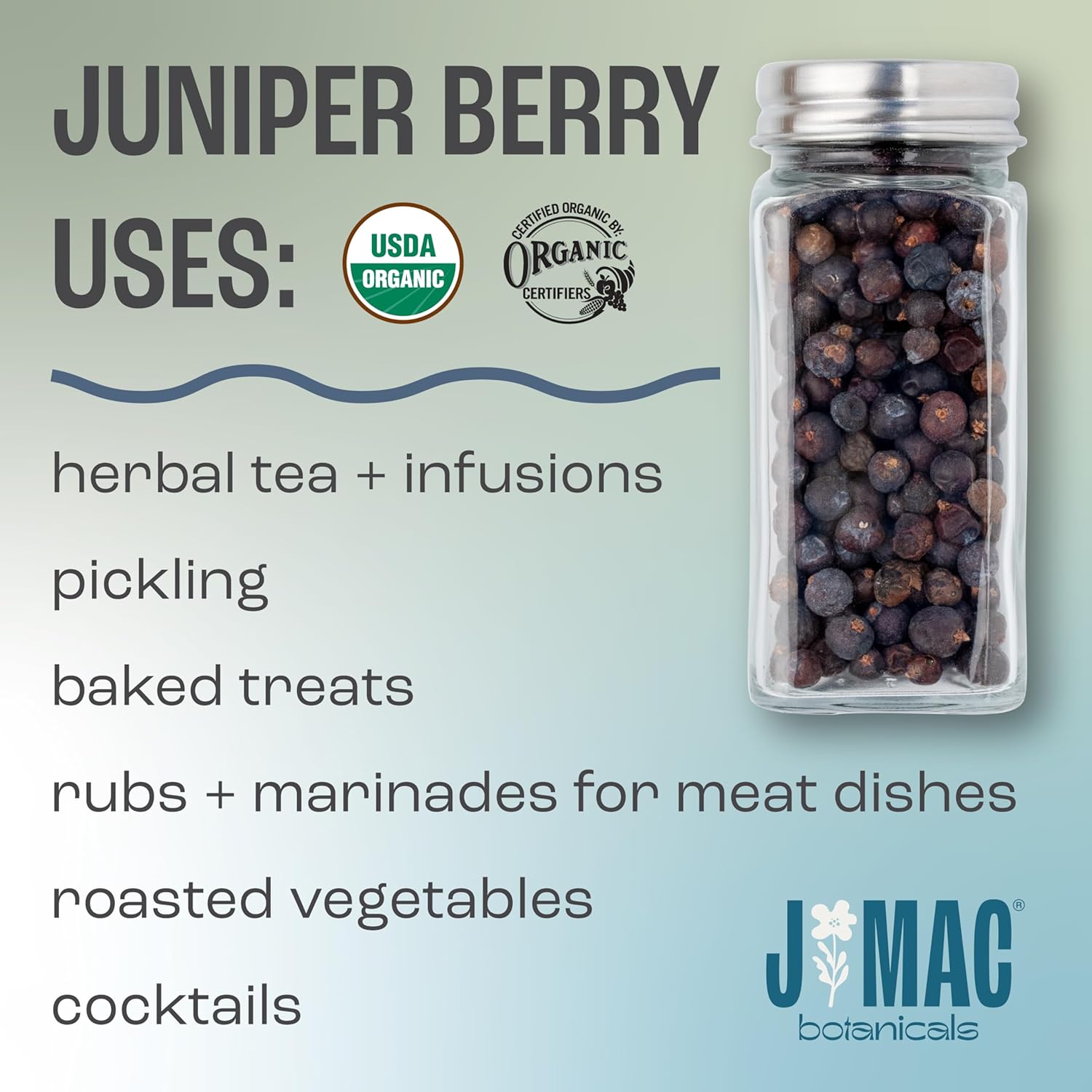 J MAC BOTANICALS, Organic Whole Juniper Berries, Certified Organic, juniper for herbal infusions, cooking and seasoning beef, pork, turkey brine, soups, syrups, cocktail bombs (4 oz)