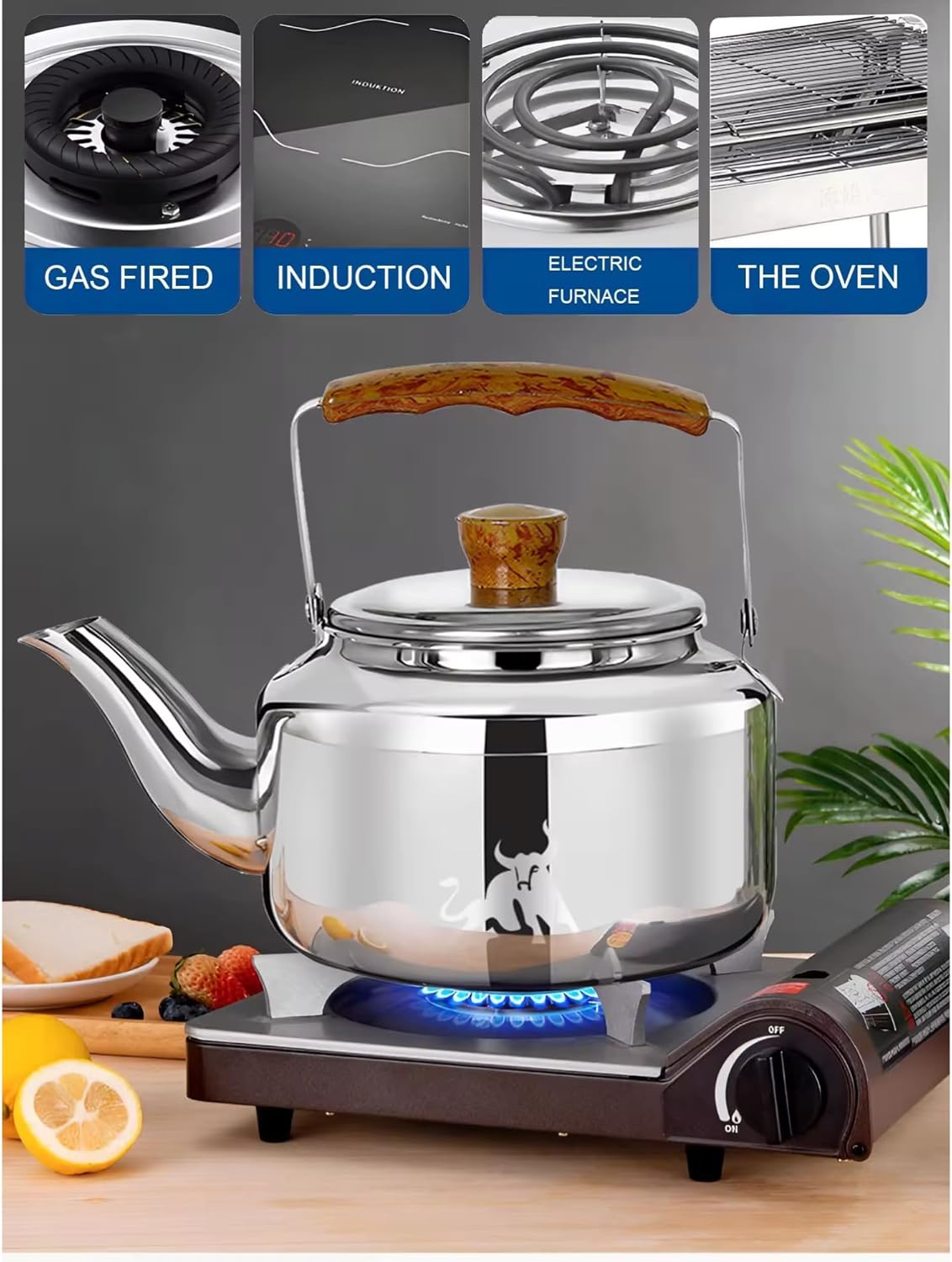 - Durable Stainless Steel Build: This tea pot is made from strong stainless steel that won't rust, and it's shiny and easy to clean inside and out this tea kettle is really tough, with a thickness of 0.4mm, so it's hard to dent. This kettle pot is made from stainless steel 201, which is really strong. The handle of our camping kettle designed to make pouring easy! The burner tea pot has a handle that's easy to hold and won't get hot, so you won't burn yourself.