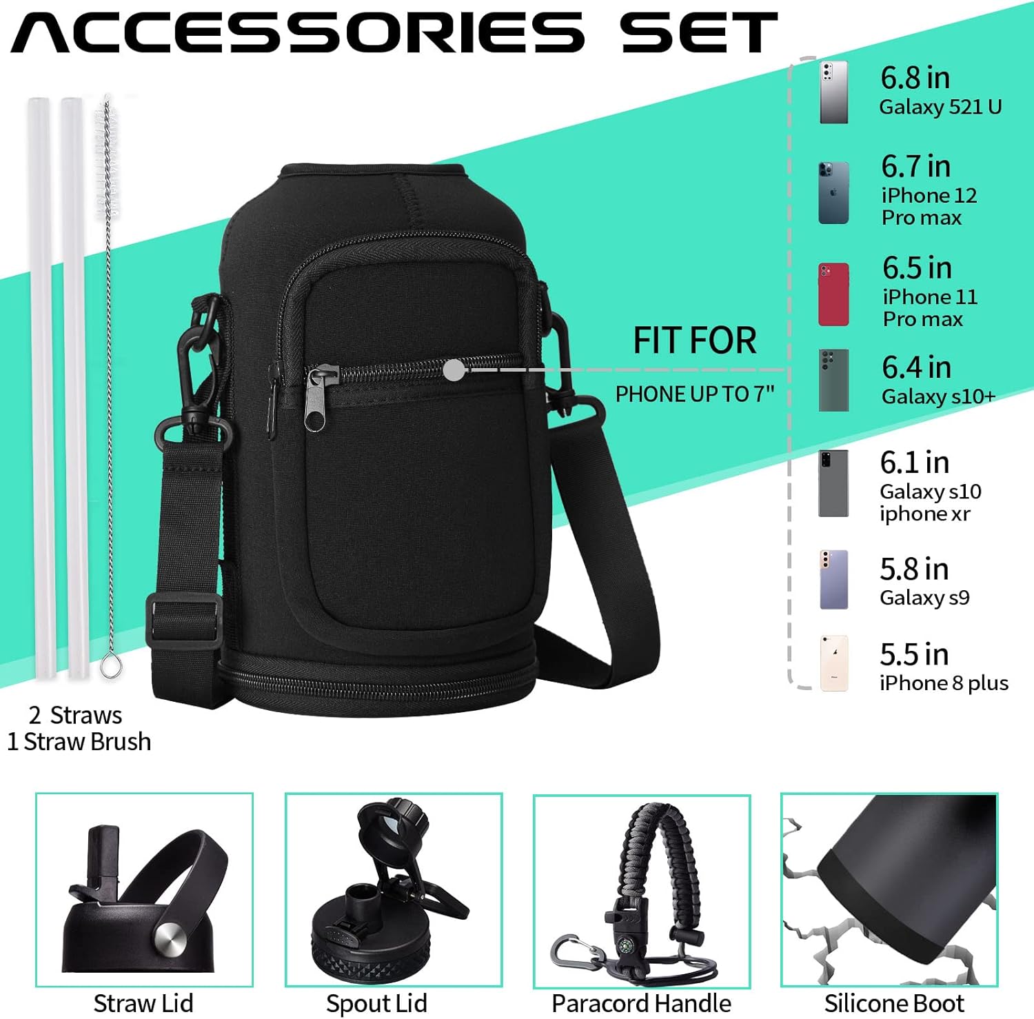 - PROTECTIVE BOOTS & STORAGE SLEEVE: Upgraded silicone boots prevent shattering and cracking when stainless steel water bottle accidental dropped. And storage carrying pouch with removable shoulder strap for convenient hands free carrying! The safe zippered pocket design to stores all your stuff, holds your cards & phone & key