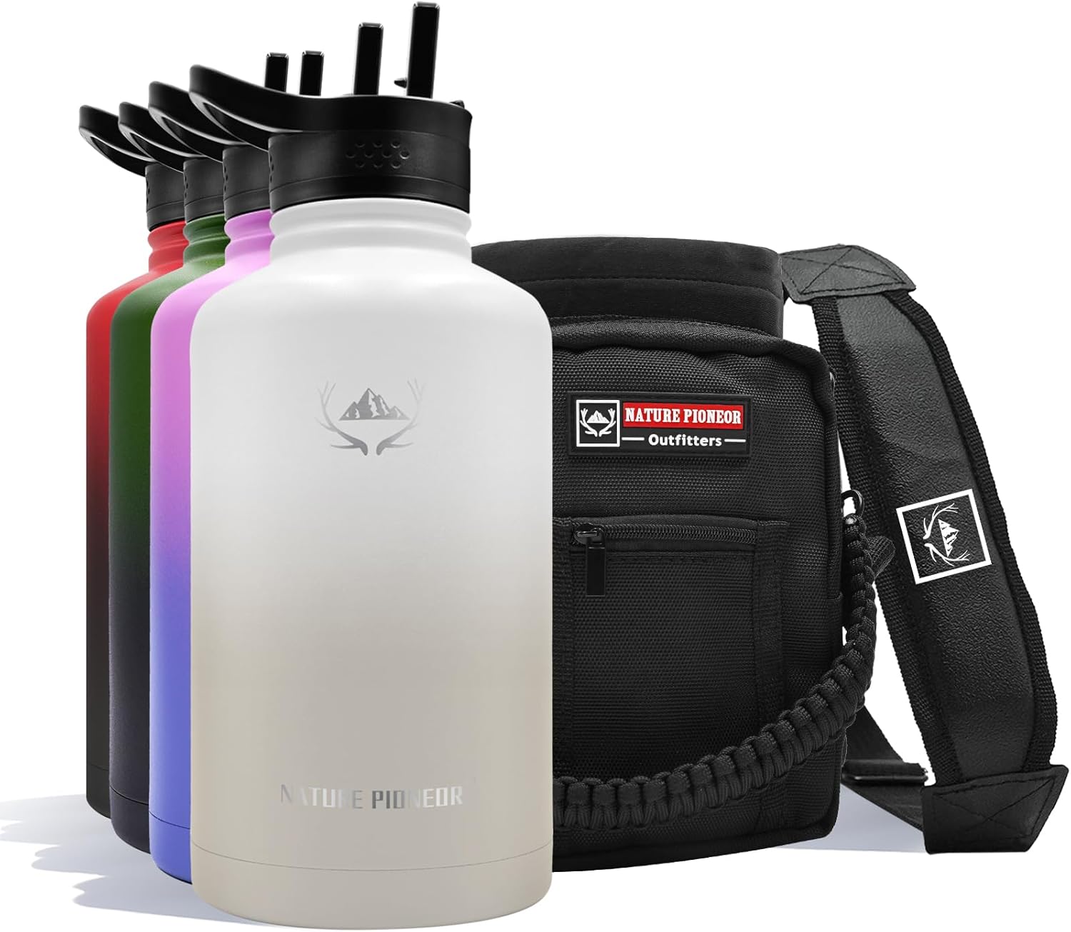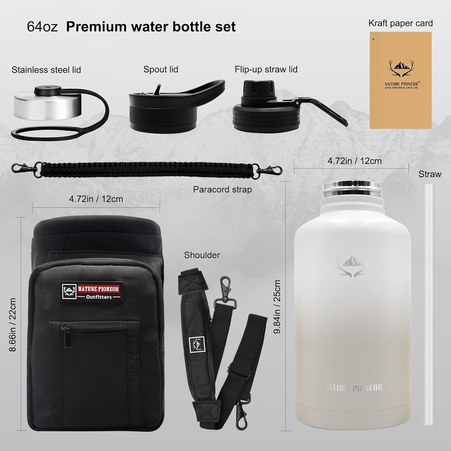 NATURE PIONEOR Insulated Water Bottles with Straw - 64oz Stainless Steel Vacuum Bottle with Holder/Carrier/Sleeve - Reusable 18/8 Food Grade Half Gallon Water Jug