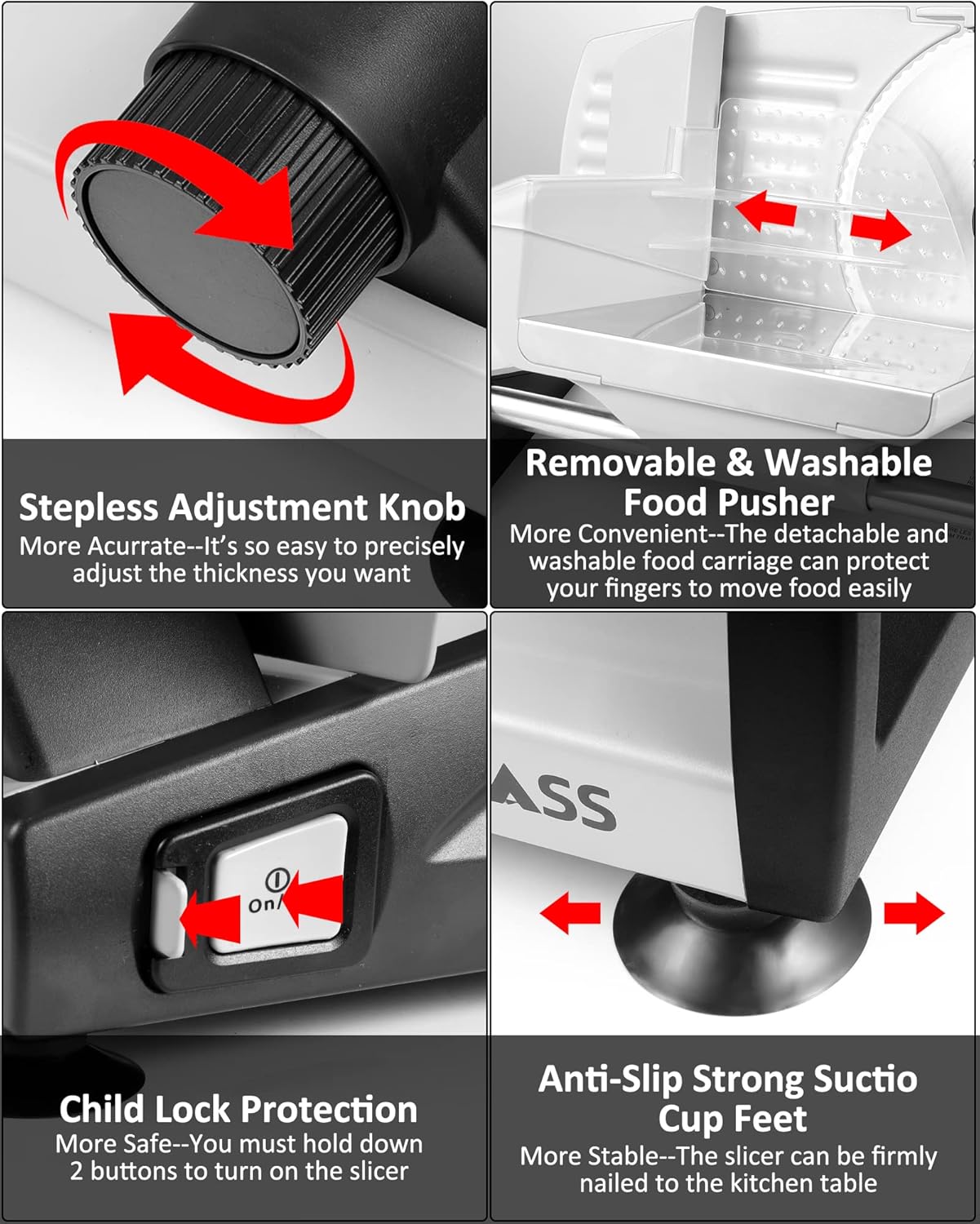 - [200W Powerful Power with Switch Child Lock] - 200W fast, high-yield slice power drive, you must press the safety lock and power button at the same time to start, to avoid misoperation and avoid accidental touch by children. Enough power and speed to cut almost anything. Not just raw meat, but cooked meat, cheese, bread and vegetables.