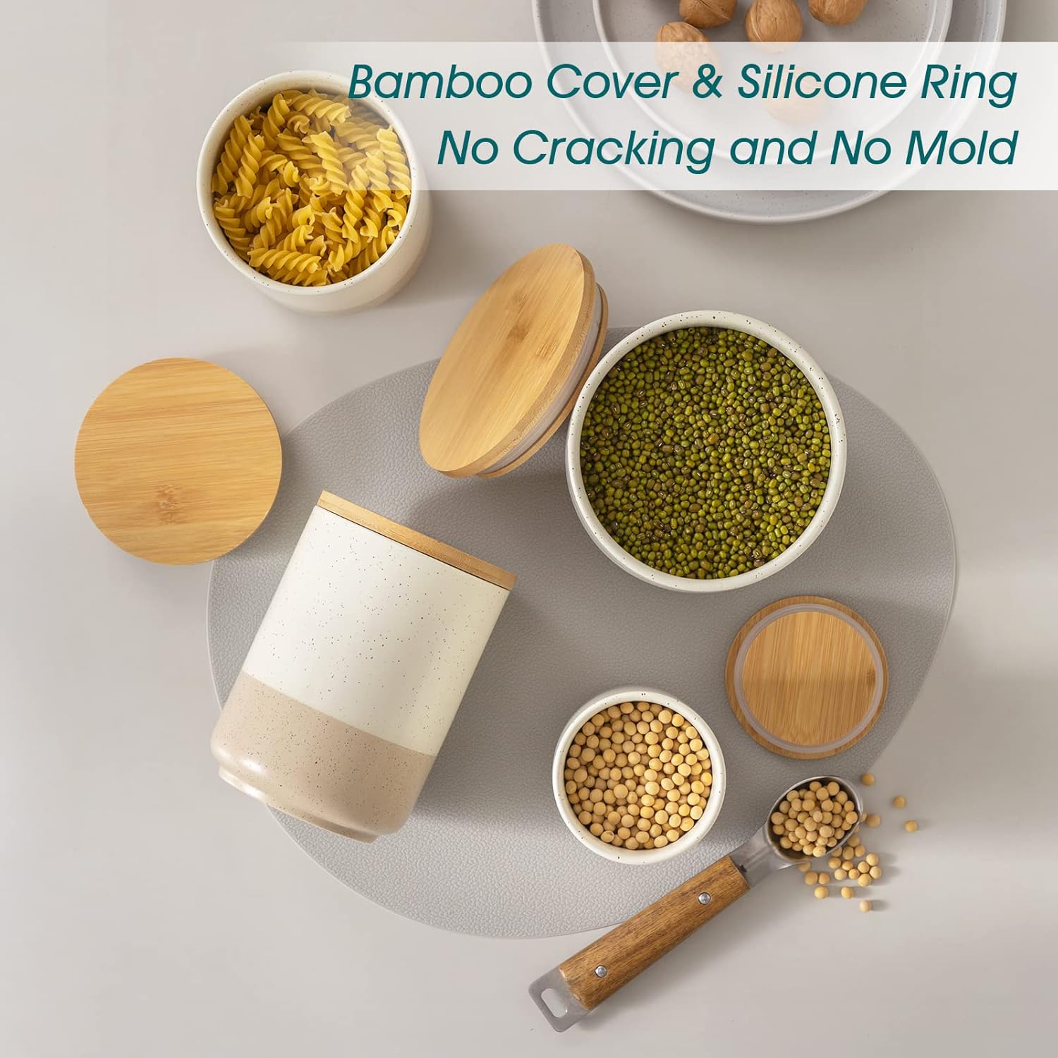 - 【High-quality Material】The canisters are made of high-quality terracotta, which is not easy to crack, and is more durable than plastic and glass. The lid is made of wood, with sealing rubber ring to improve the sealing. Effectively keep the items dry and fresh.