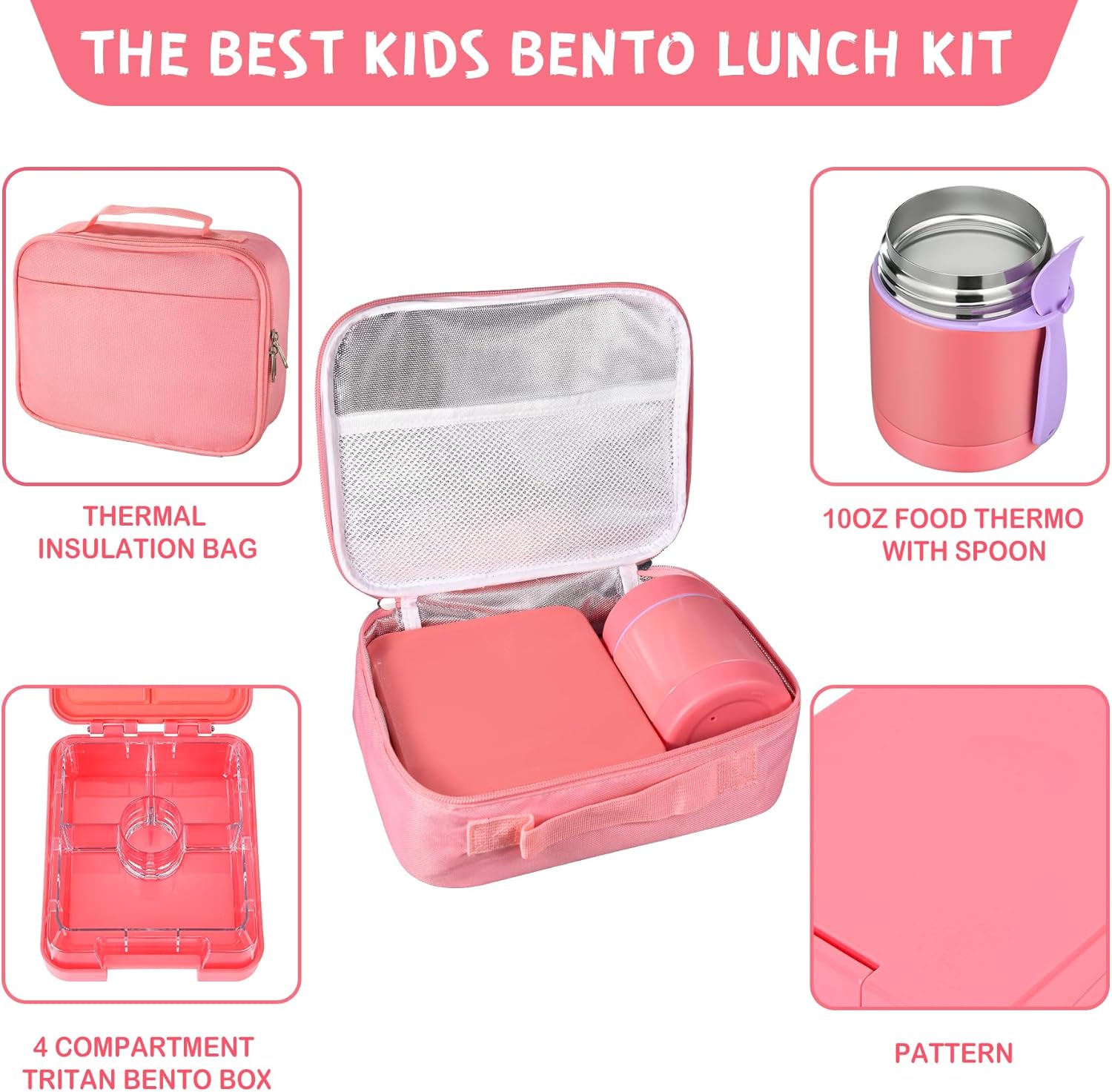 Bento Lunch Box Set With 10oz Soup Thermo, Leak-proof Lunch Containers with 4 Compartment, Kids Hot Thermo Food Jar/Insulation Lunch Bag, Food Containers for School(Solid)