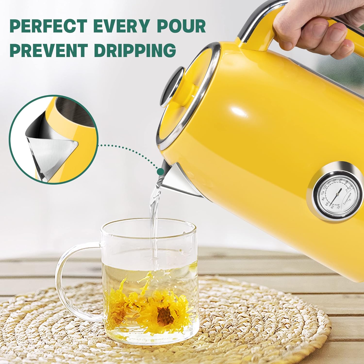 SUSTEAS Electric Kettle - 57oz Hot Tea Kettle Water Boiler with Thermometer, 1500W Fast Heating Stainless Steel Tea Pot, Cordless with LED Indicator, Auto Shut-Off & Boil Dry Protection, Retro Yellow
