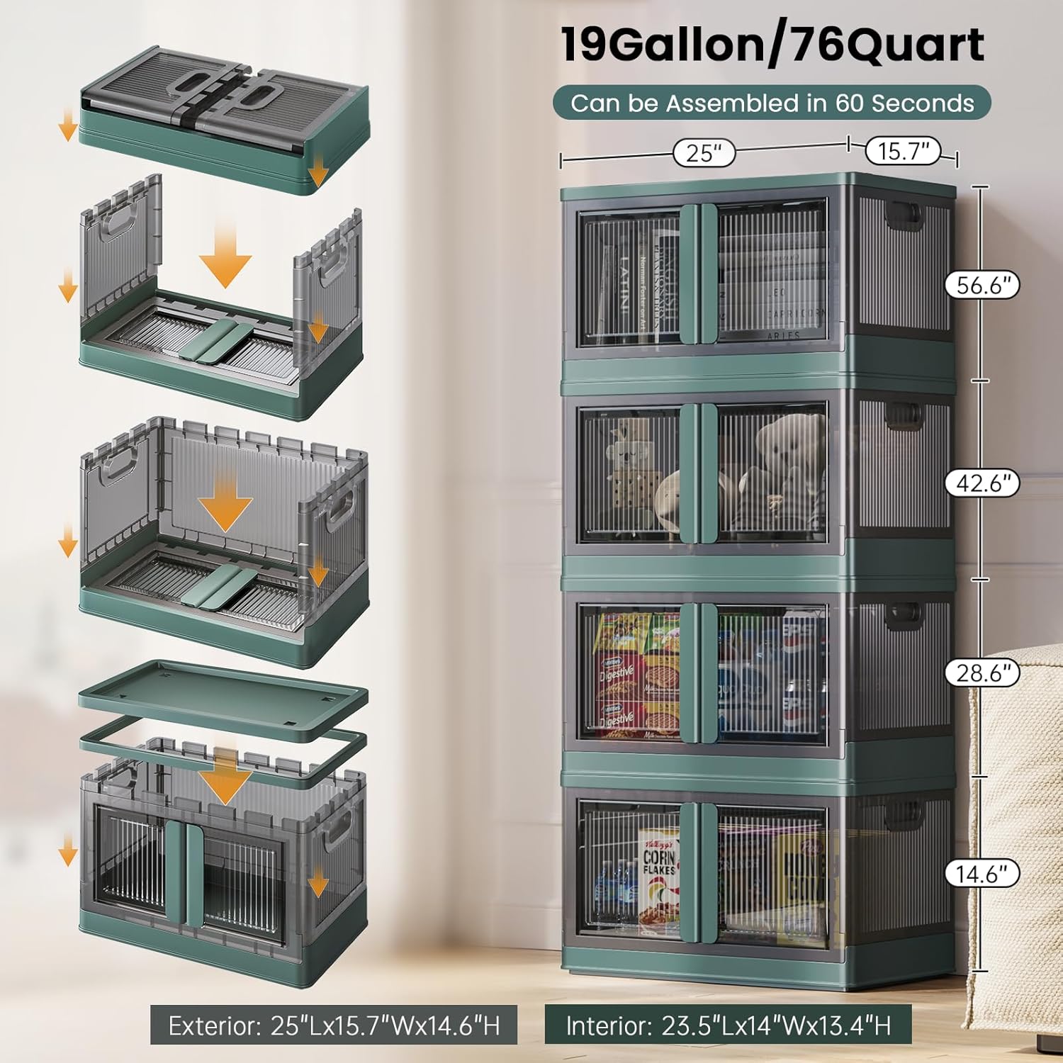 19Gal Collapsible Storage Bins with Lids & Wheels - 4 Pack Stackable with Doors, Heavy-Duty Plastic Containers for Home/Office, Green