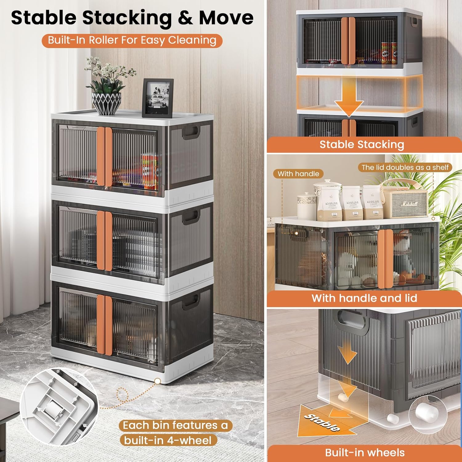 19Gal Collapsible Storage Bins with Lids & Wheels - 1 Pack Stackable with Doors, Heavy-Duty Plastic Containers for Home/Office, White