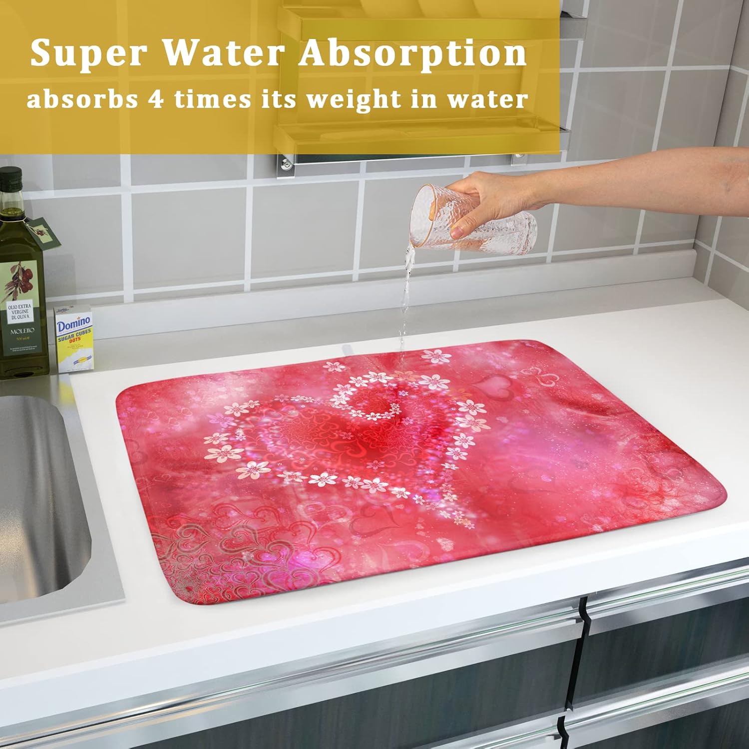 - 1【High Quality Material】:Our valentine dish drying mat is made of high absorbent microfiber and the middle is made of composite sponge durable, reversible do not fade and comfortable.