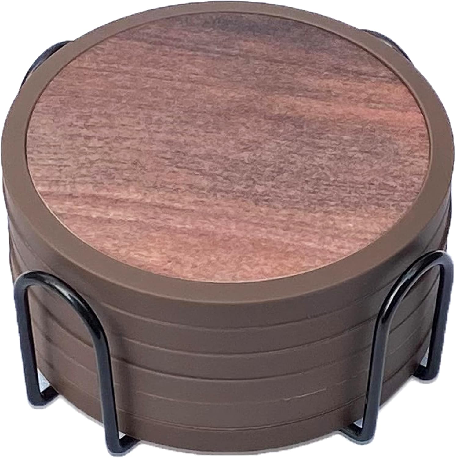 - WHAT YOU GET: 6 non-slip silicone drink coasters(round, brown, 4.3 inch), 6 absorbent felt inserts(round, wood pattern on both sides) and a 4.5-inch metal holder(black). The silicone coasters can be used alone, or with the inserts