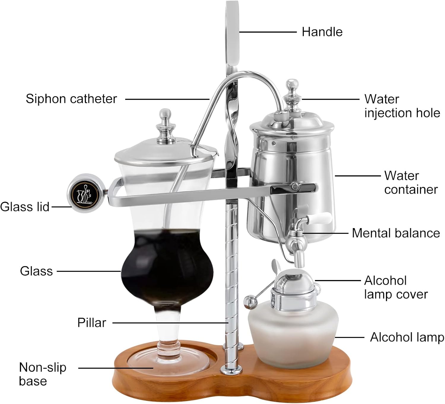 LOYALHEARTDY Vintage Siphon Coffee Maker, Belgian Luxury Syphon Coffee Machine with Royal Family Temperament, Silver Retro Royal Family Balance Siphon Coffee Maker Siphon Brewer Vintage Coffee Pot