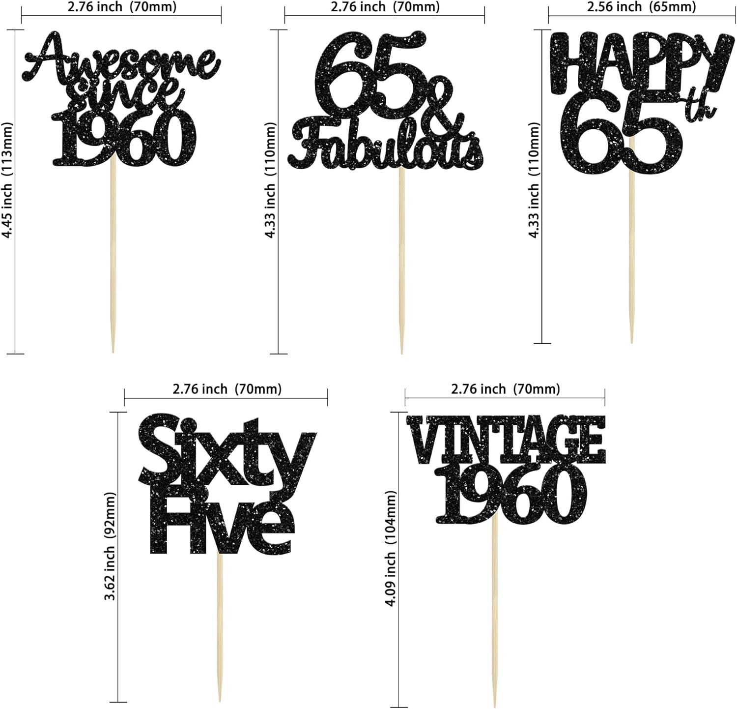 - ♡These glitter Black 65 Cupcake Toppers are so cute and good for vintage 1960 theme party, 65th birthday party, 65th wedding anniversary birthday party cake decoration. They can make your cupcake more attractive and bring the fun to your party. You can also apply them for ice cream, fruits, cookies and other desserts.
