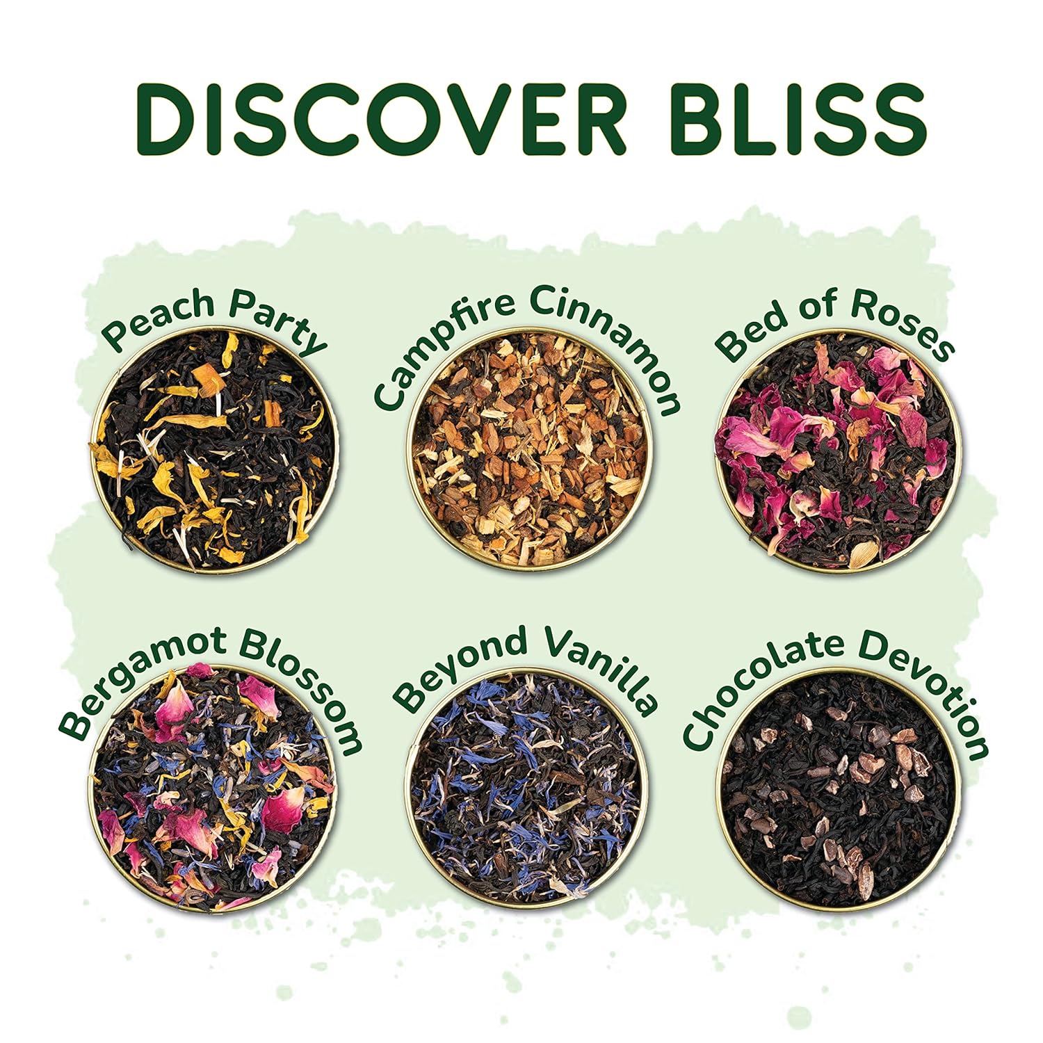 - EXOTIC FLAVOURS - our Discovery Bliss loose tea sampler gift box contains a tea assortment of Bergamot Tea (Earl Grey Tea), Beyond Vanilla, Peach Party, Campfire Cinnamon, Chocolate Tea and Bed of Roses blends in exclusive golden tea tin caddies, inside a gold foiled gift box making it a perfect tea variety pack and black tea sampler gift for her and him.Contains no colors or preservatives.