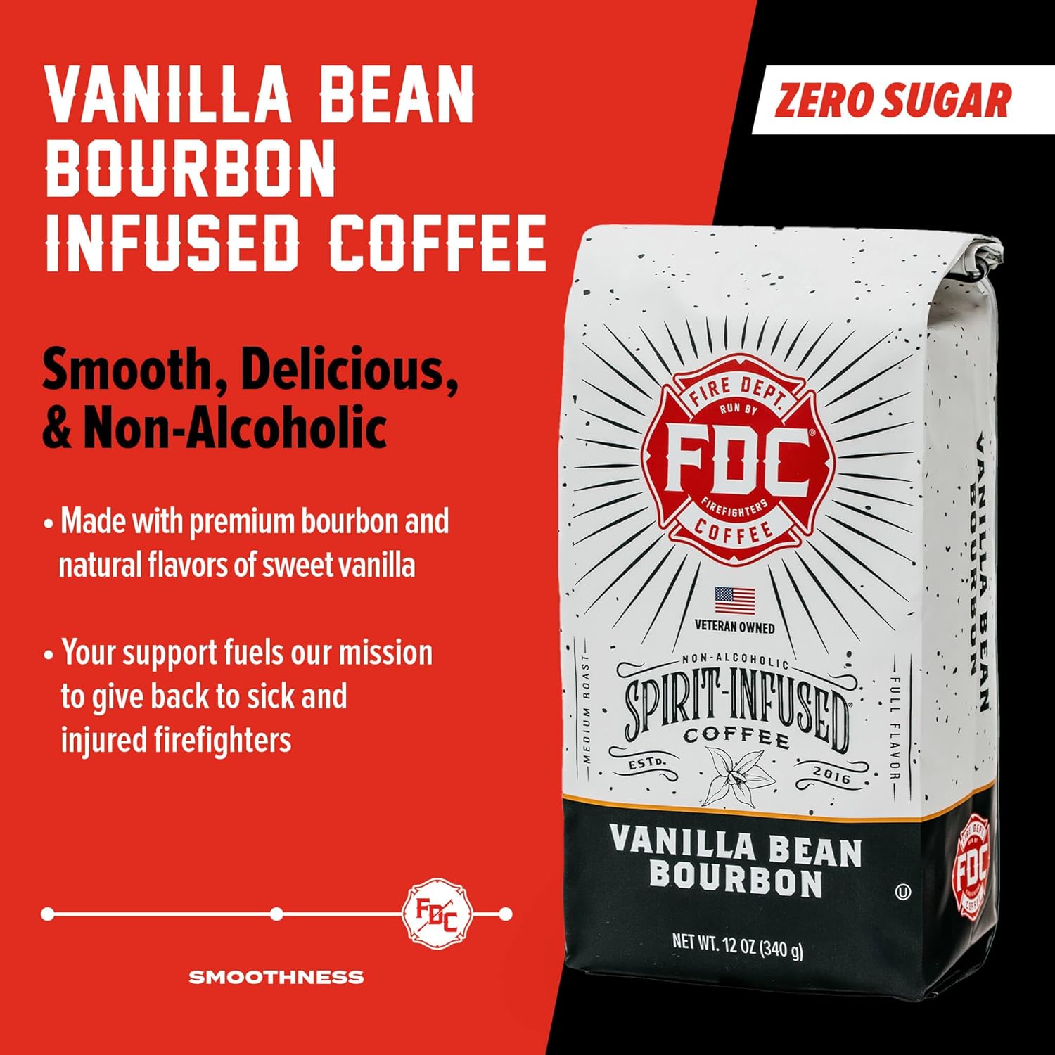 Fire Department Coffee - Vanilla Bourbon Coffee - Gives Back to Firefighters - Vanilla Bean Bourbon Infused Whole Bean - Non-Alcoholic - Roasted in the USA - Veteran Owned - 12 oz
