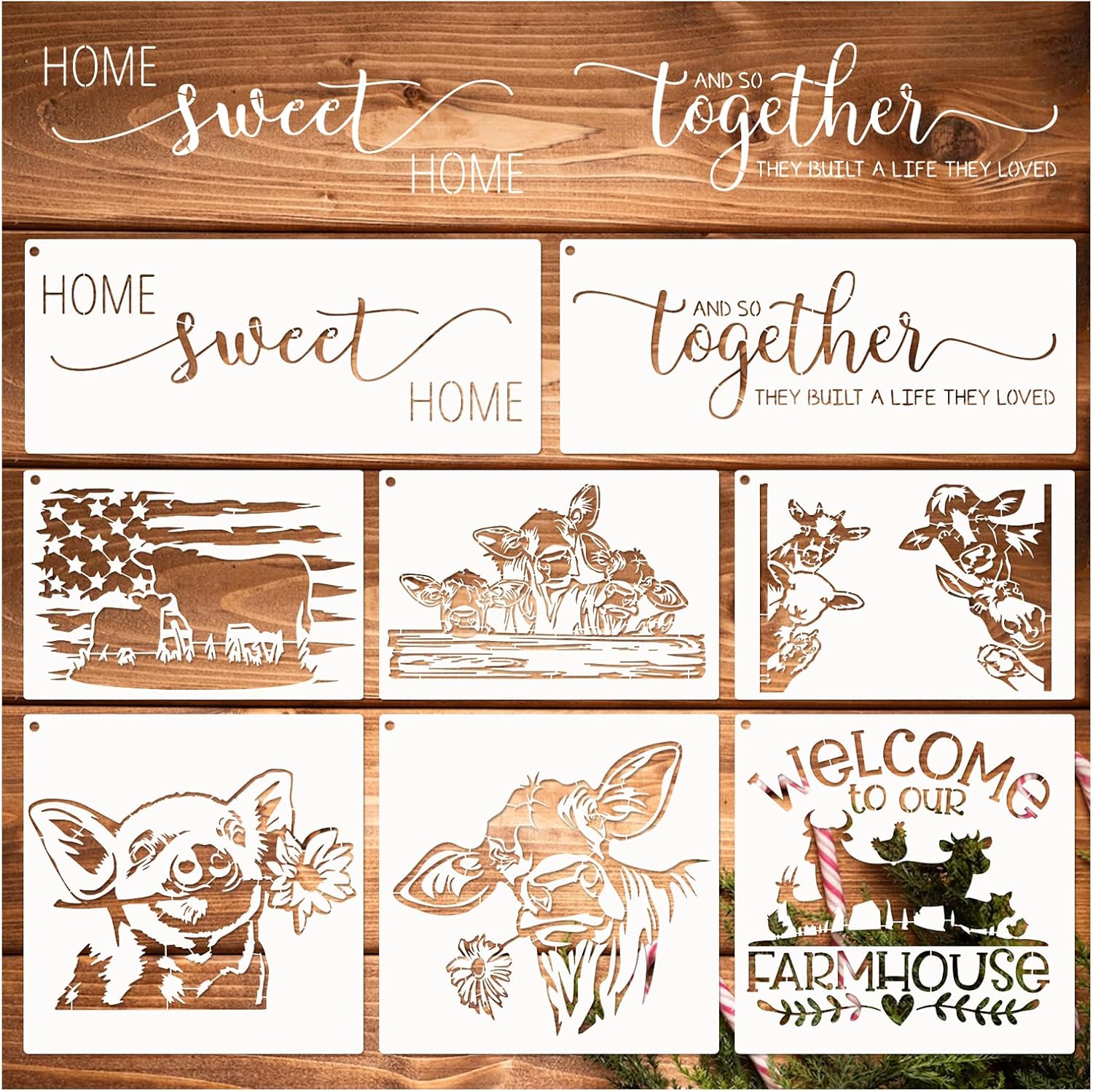 - Farm Theme Stencils: There are 8 pieces reusable farmhouse stencils and 1 pcs metal open ring in our package, they are designed with different patterns, sufficient quantity and rich patterns are enough for your daily DIY crafts needs