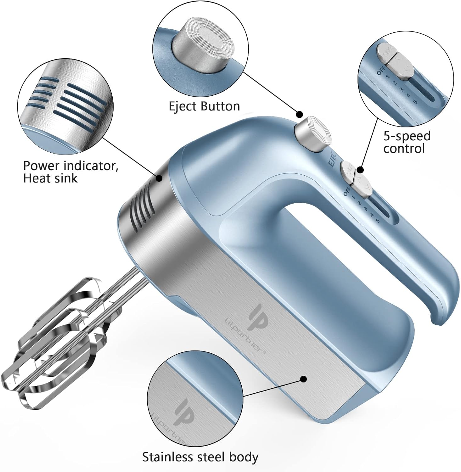 - ❤VERSATILE SAFE ATTACHMENTS : Electric hand mixer includes 5 stainless steel attachments, two dough hooks, two beaters and a whisk, perfect for cooking or baking.