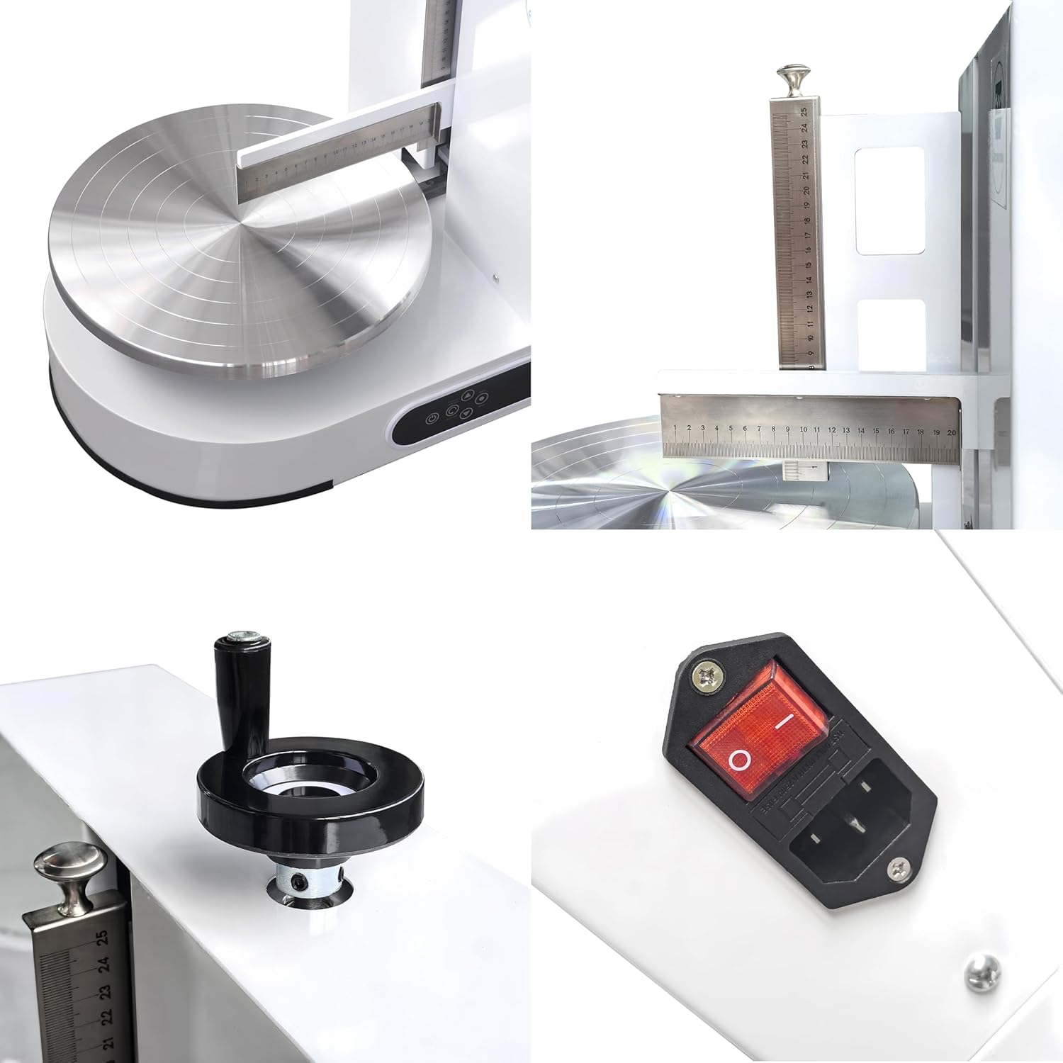 - [Fit for cake size] D13.78"(35cm) big rotary table can be used to make 6-14 inches cakes. Cake Height: 0-19.9cm/(0-7.83").Cake size and height can be adjusted.Rotation direction:Clockwise and counterclockwise to meet various needs.An adjustable scraper.Waterproof function key.Easy to operate,Good performance.Simple design for easy cleaning.