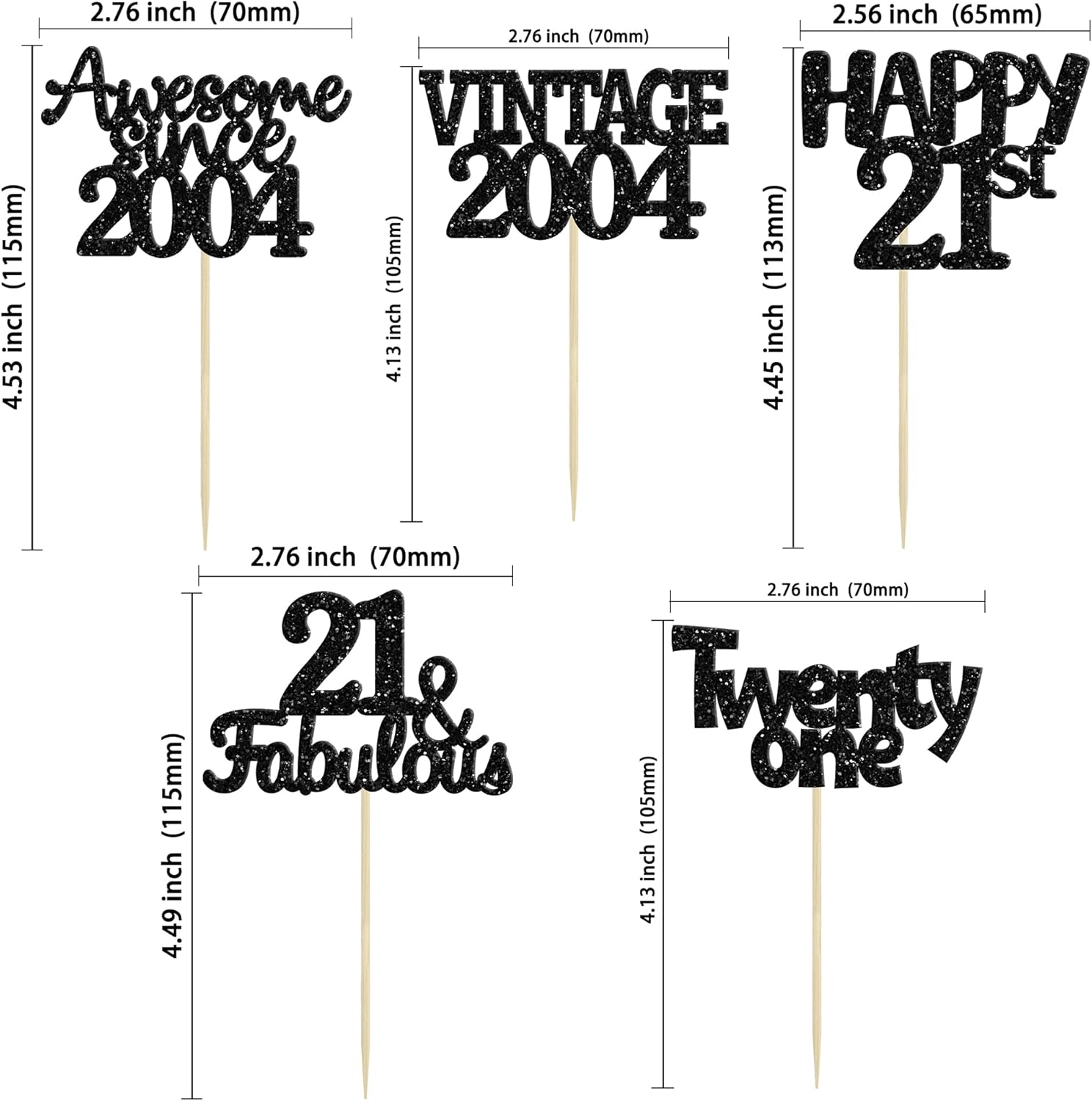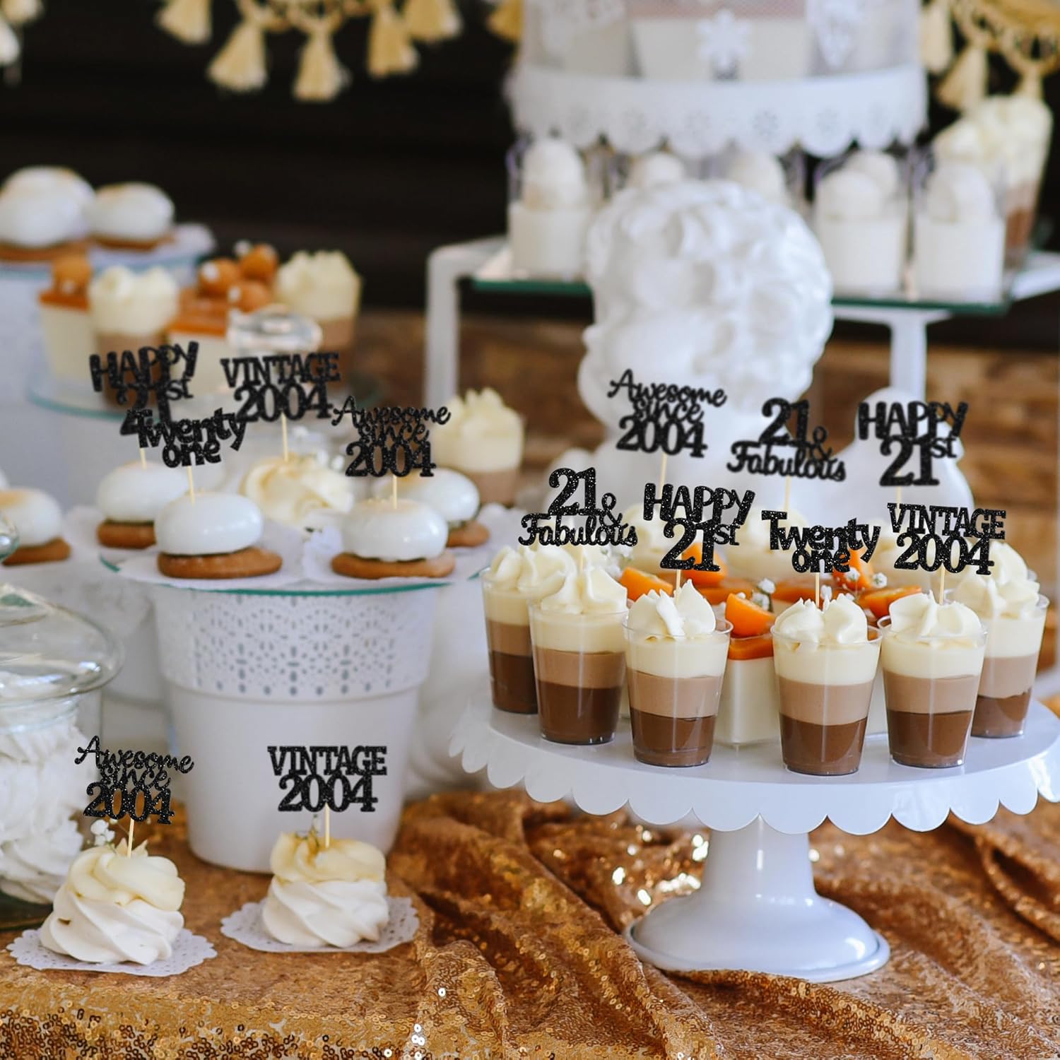 Gyufise 30pcs Vintage 2004 Cupcake Toppers Glitter Twenty-One Happy 21st Cupcake Picks Fabulous Anniversary Party Supplies Black
