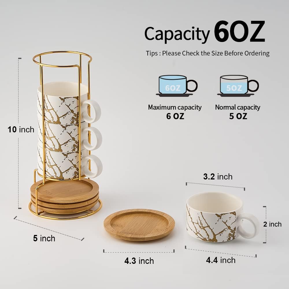 LUKA Porcelain Espresso Cup with Metal Stand, 6 Ounce Stackable Ceramic Demitasse Espresso Mugs Cappuccino Cups Set for Latte,Coffee,Cafe Mocha,Tea(Set of 4,White)
