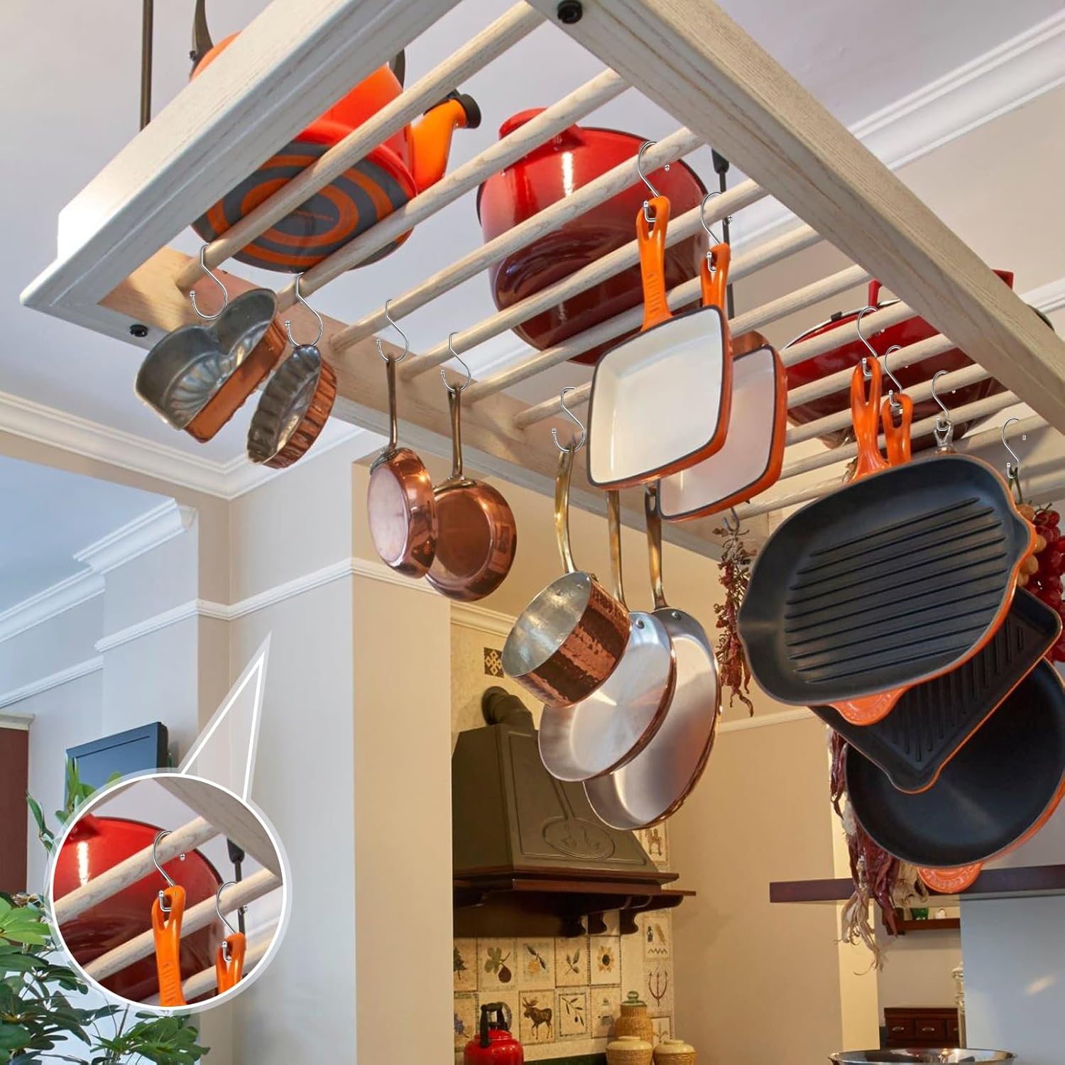 - Versatile Hooks: S shaped hooks holds well for pots and pans, oven mitts, mugs, towels, curtains, pants, caps, tools, crafts, plants, baskets, wreaths, garlands; can be used around the house like pantry, kitchen, bathroom, laundry, garden, garage, camper, RV, trellis, fence, gutter, deck; functional storage hooks with many uses, really serve its purpose