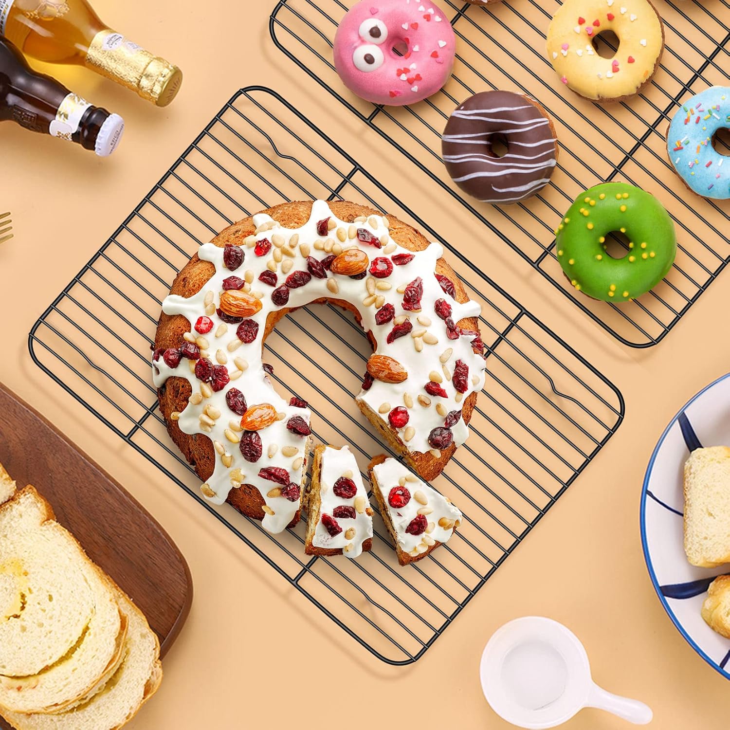 - 【CONSIDERATE DESIGN】Our cooling racks are finished by black coating, Provide a classical elegant look, 2x Strong firmly welding rods make racks more sturdy and stable, Dense lines avoid small food falling through, 4 x 0.6 Inch support feet raise the rack up for better air circulation to make the food baked evenly, Also helps cookie and cakes cooling faster, Smooth edge and no sharp place for comfortable griping