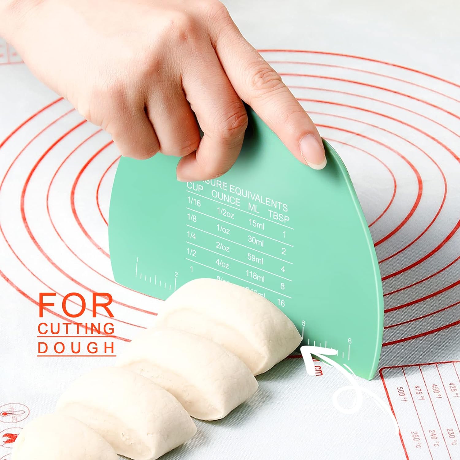 - Multi-Purpose Food Scrapers: 2Pcs green dough scrapers the size is 6.1" x 4.5" (15.5cm X 11.4cm). Suitable size and reasonable design make dough scrapers used for entire baking process. Cut dough, cake, noddles, transfer and shape dough, smooth cake, scrap batter or mixture, clean off baked cooked residue, etc