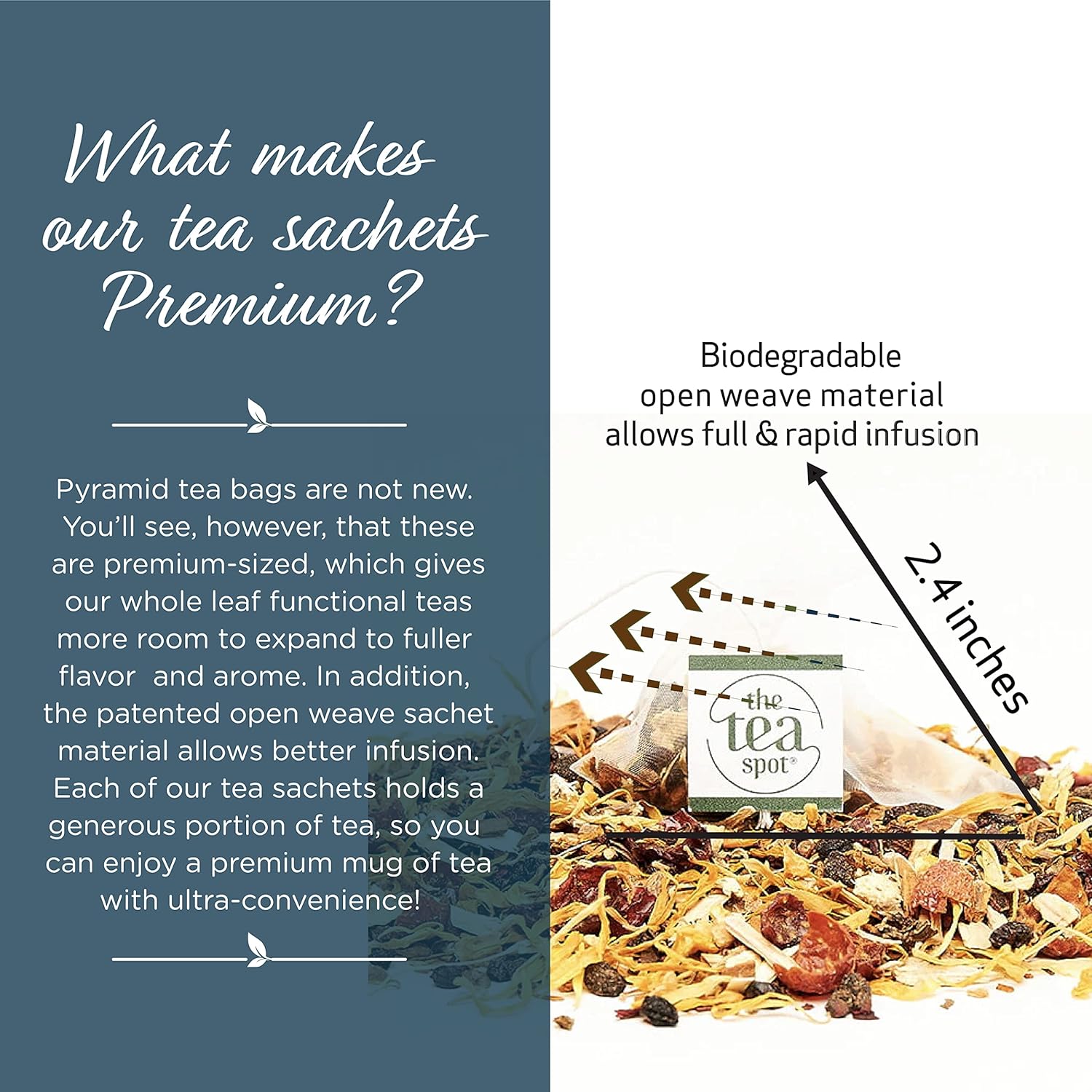 - PREMIUM TEA BAGS: Each pyramid tea sachet holds a generous portion, so you can enjoy a full mug of ultra-premium tea with convenience. Our large pyramid plant-based bags give whole leaf teas room to expand to their full flavor and aroma. We strive to make exquisite flavor and goodness come together in every sip of tea you take, and proudly develop, blend and manufacture all our tea products with great care and passion in the USA.