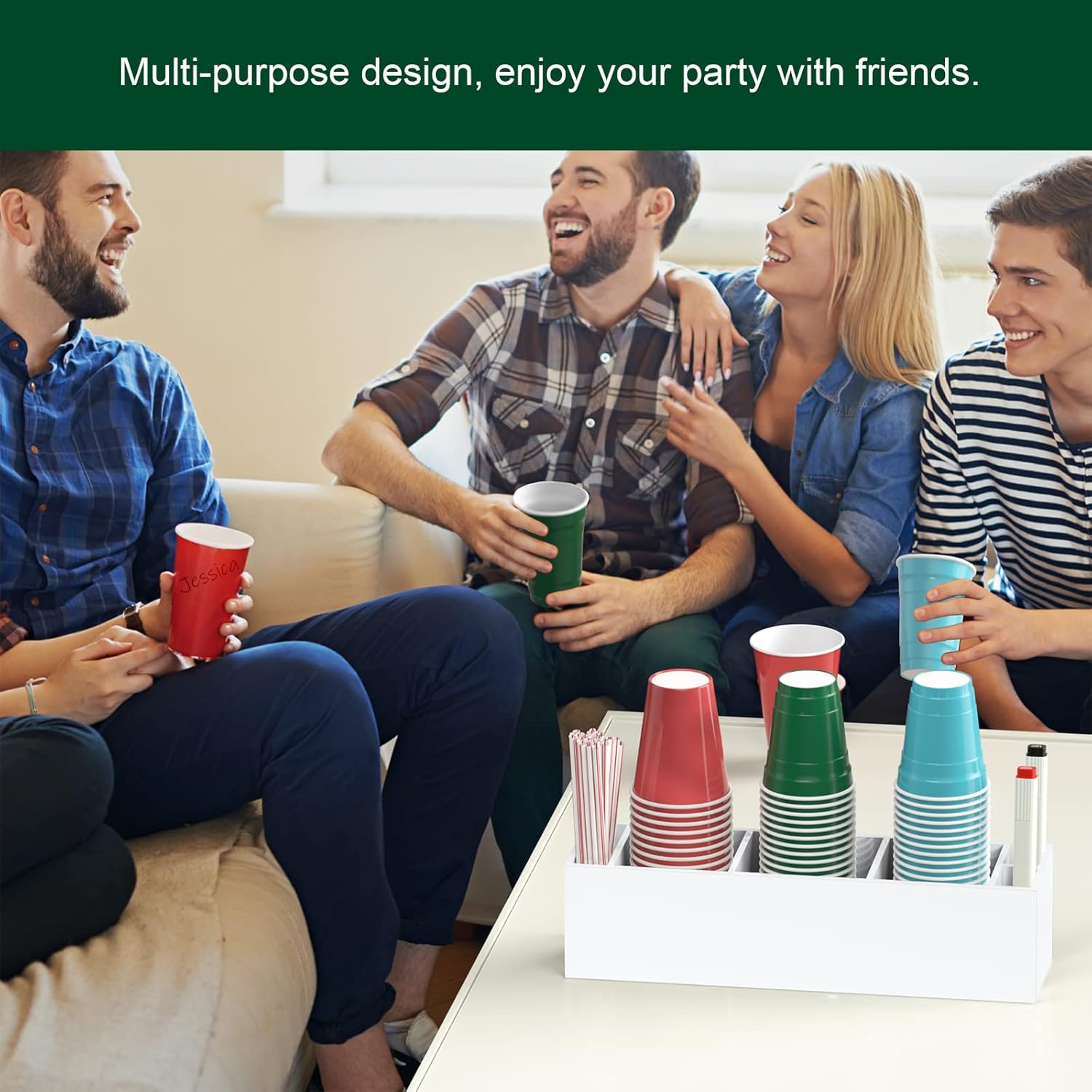 - Cup Holder with Marker Slots on Both Sides - more convenient, practical to help your family or friends save time mark their red cups and track it for refill, less waste in the gatherings, save household money! With the sided slots, you will have extra space to keep some straws, stirs, sugar packets in it when you are having a summer party, outdoor barbecue on the patio, camping trip at the lake. Can be used as a bar caddy too. Cute plastic cup holders for counter help you get rid of clutter.