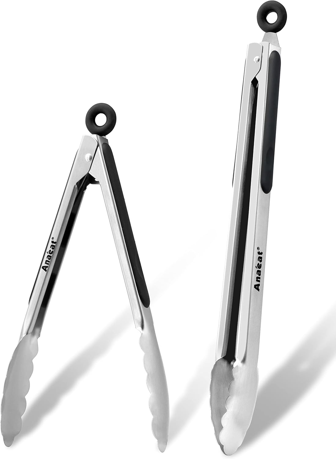 Anaeat Premium Stainless Steel Kitchen Tong Set of 2 - Sturdy Coiled Spring 9" and 12" Locking Food Tong with Non-Slip Silicone Grip for Cooking, Baking, Grilling, BBQ - Heat Resistant up to 480°F
