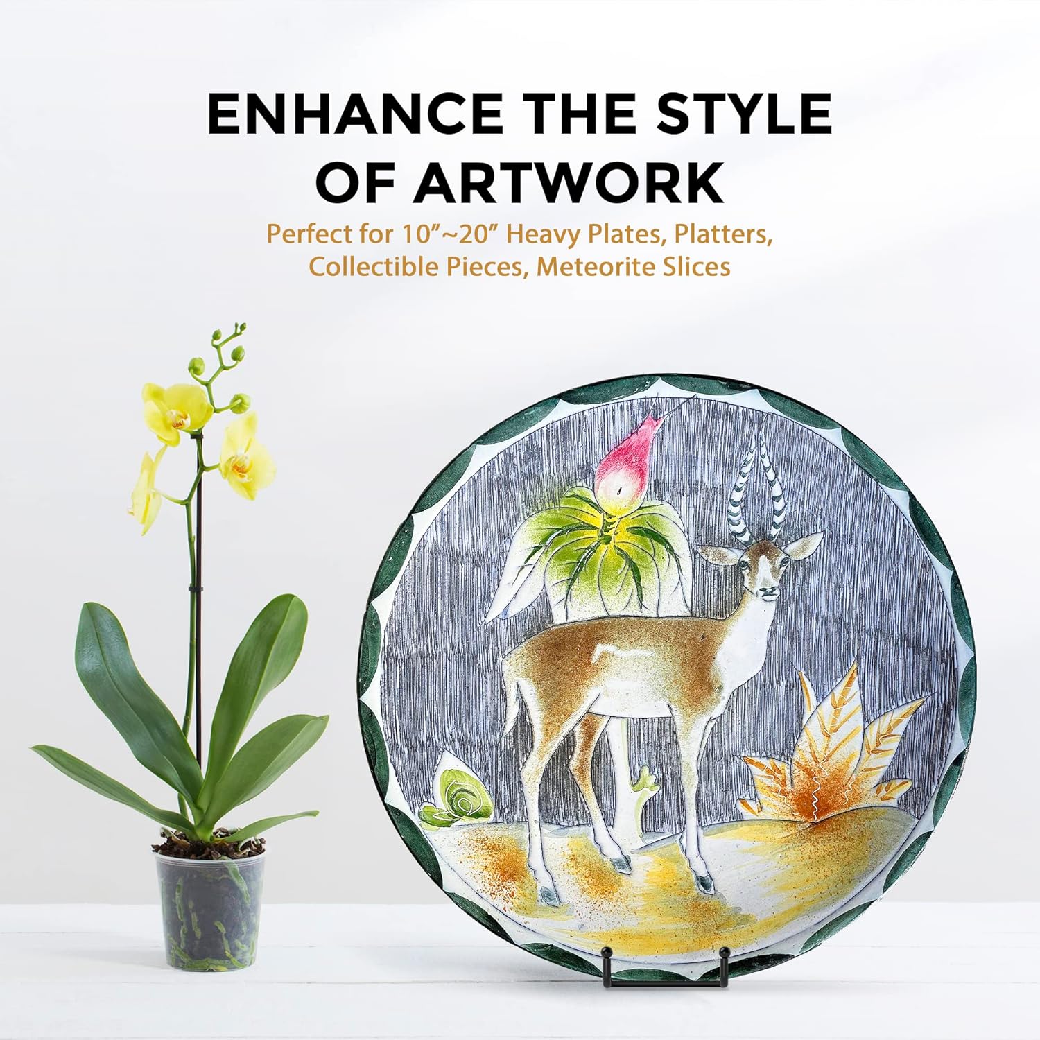 - STURDY DESIGN: - Made with wrought iron construction and a matte black powder-coated finish, this plate display stands features a reliable 8" depth and 4" widened base design, capable of securely displaying a variety of large items such as decorative plates, platters, plaques, photo frames, trays, tiles, cutting boards, cookbook, sign, canvas art, and more.