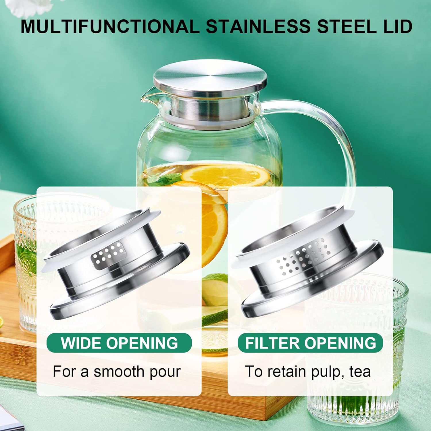 - 【Two Different Pour Functions】This glass pitcher has two ports, the small hole for straining the tea leaves to keep the pulp iced, and the large hole for pouring out the pulp. The lid of this glass water pitcher is made of 18/8 stainless steel, which is durable and rust-resistant. The lid features a food-grade silicone ring for a tight seal, preventing leaks or accidental spills when the jug is tilted.