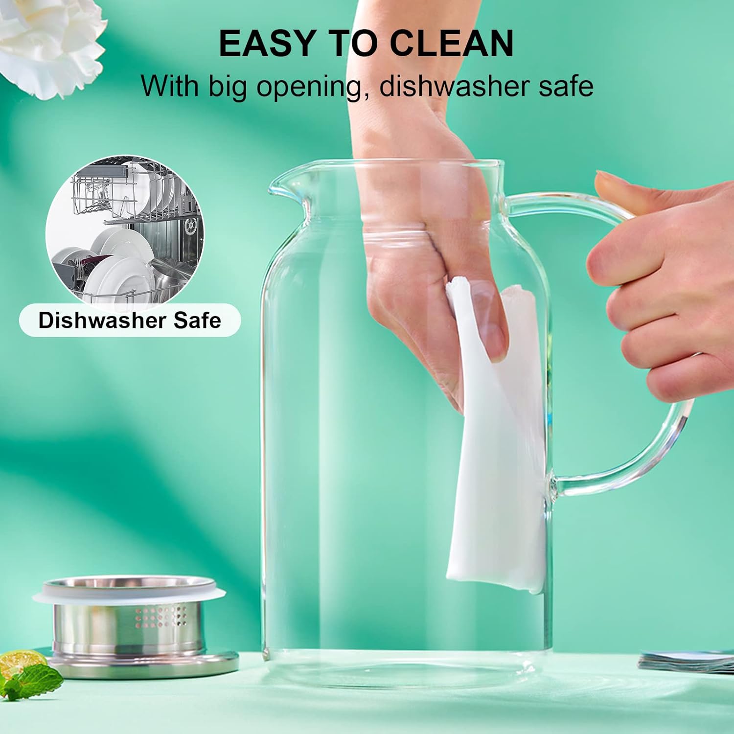 - 【Wide Mouth Opening for Easy Cleaning】The wide opening of this glass water pitcher allows your hands to easily reach the bottom, making it easy to clean the inside of the pitcher. Dishwasher safe. Its smooth surface is less prone to stains than other materials, so you just need to rinse with water to keep it looking like new.