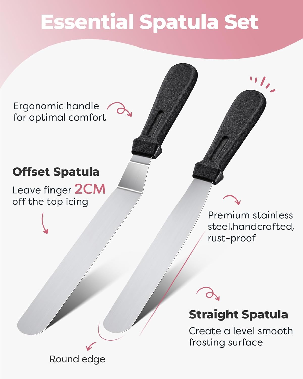 - Essential Cake Decorating Supplies Kit: This baking supplies has everything you need to create beautiful cakes, including 2 frosting spatulas, 3 scrapers, and an easy-to-use cake turntable. No need to buy extra products — all you need is the frosting, the cake, and this cake decorating kit!