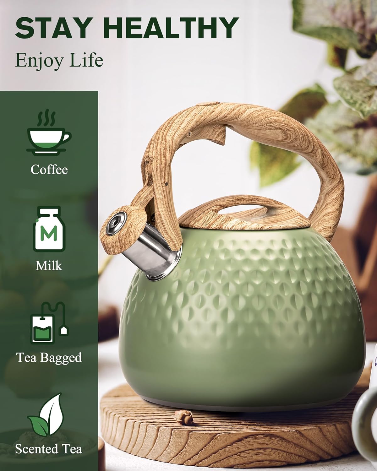 - Loud Whistle Grab Your Attention Easily : Loud & automatic whistling catch your attention even in a noisy environment. When you focus on your housework, movies, music, or any other things, the tea pot will remind you with a whistle after boiling water. To prevent you from forgetting to turn it off and drying the water up