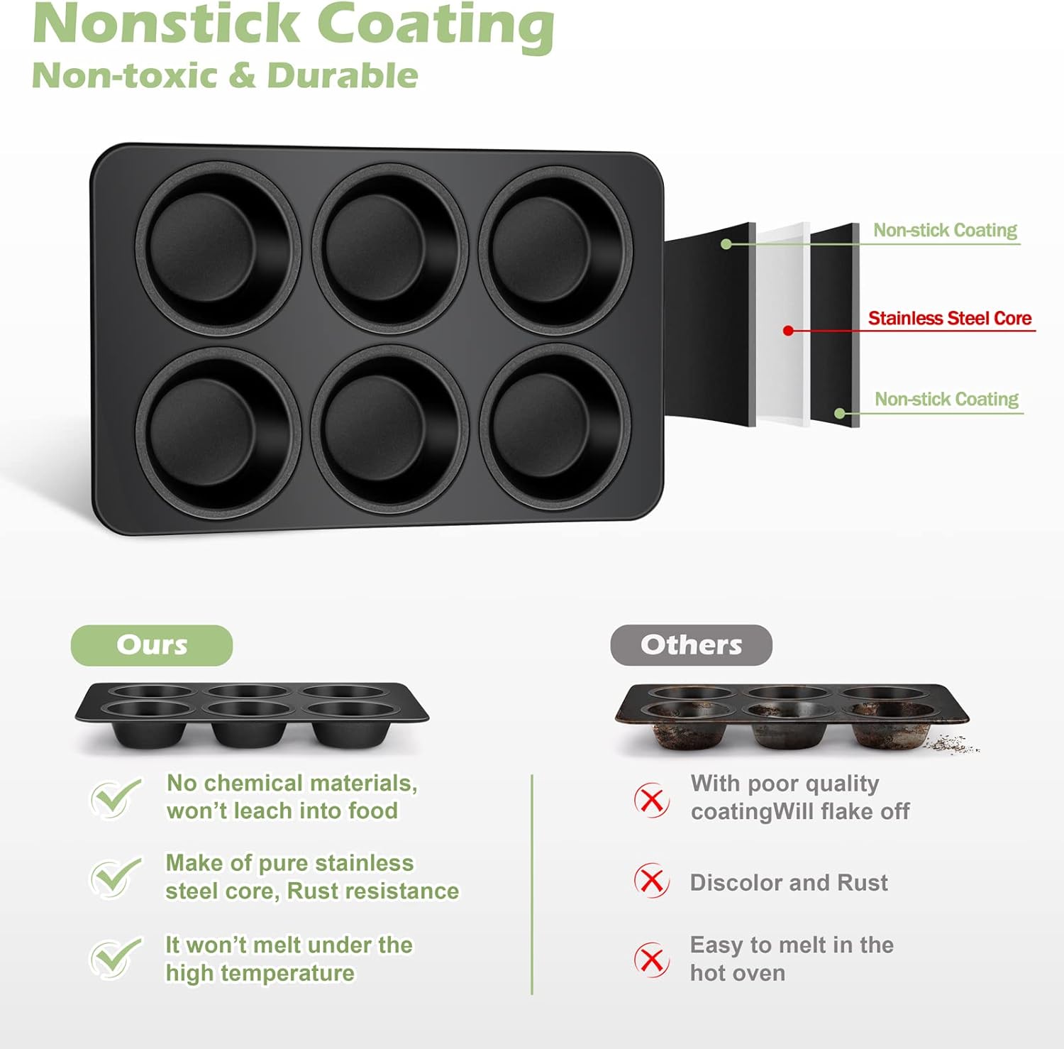 - HEALTHY & DURABLE: The muffin pans are made of pure stainless steel core with healthy coating, Without any toxic or chemical materials, Won’t leach into food, Proper weight when holding in hand, Rust resistant and no deformation for long serving life