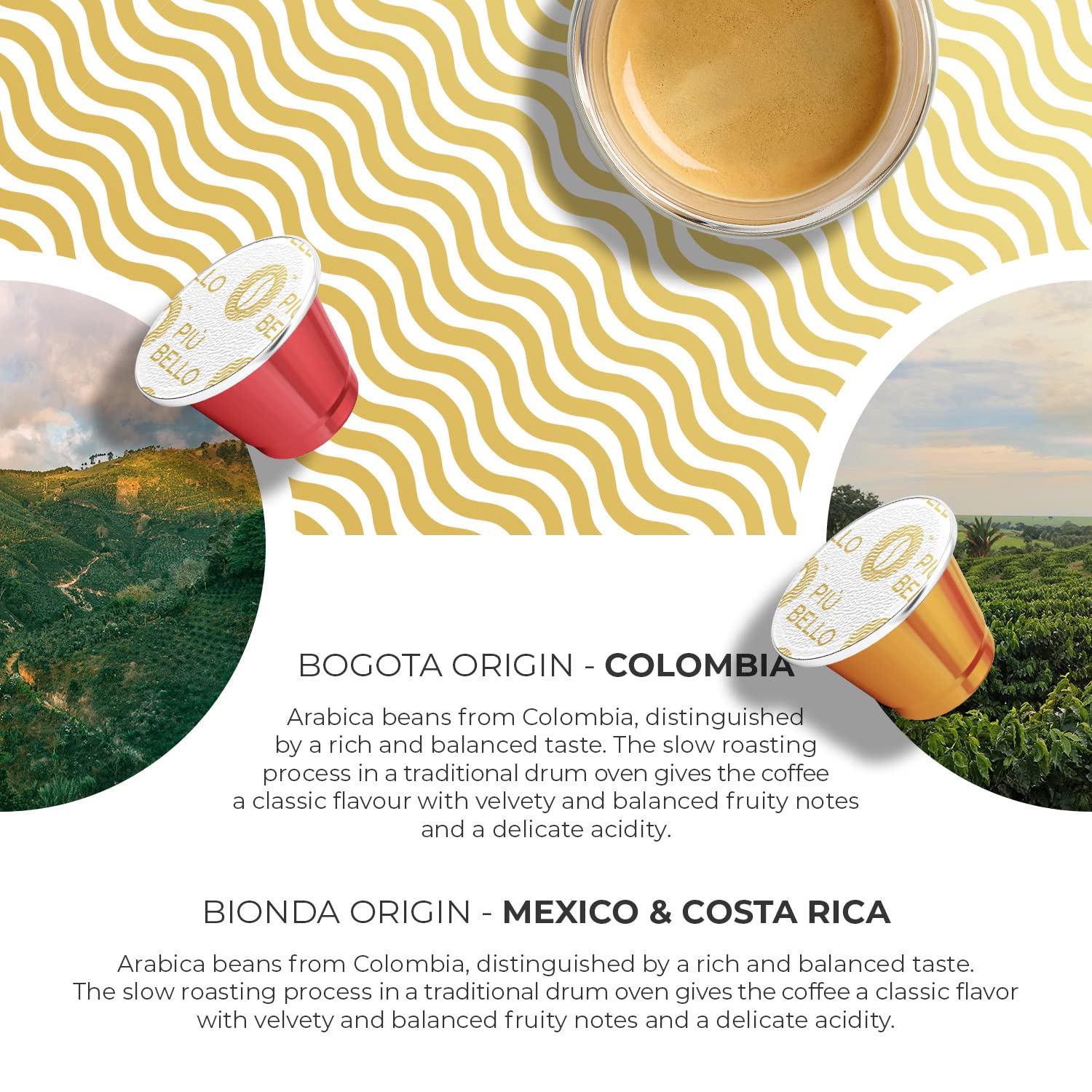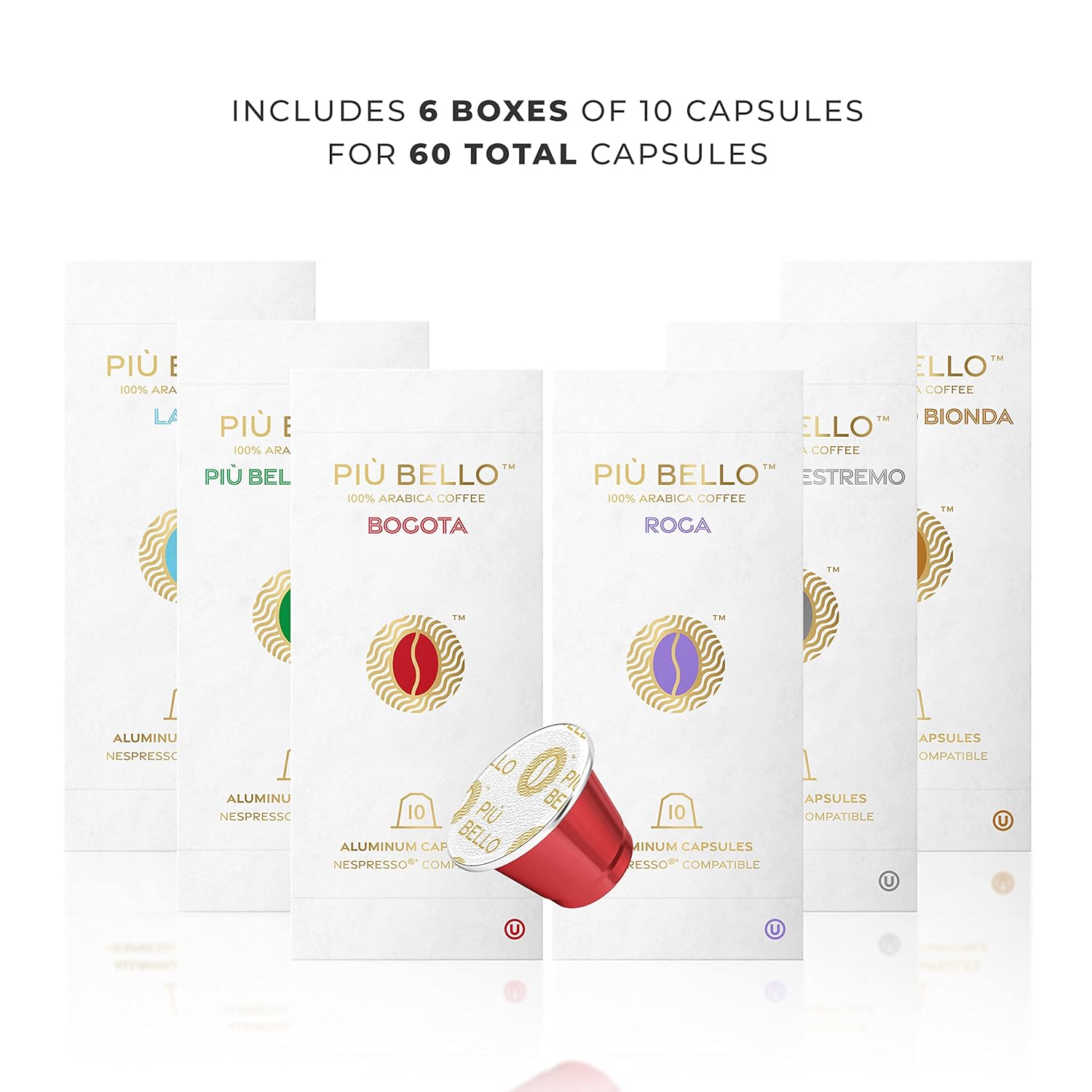 - 6 FLAVOR MULTIPACK COFFEE - Choose this 6 flavor multipack of Nespresso pods and enjoy every delicious variety from Piu Bello including Bogota flavor, Roga flavor, Lazio flavor, Piu Bello Blend, Espresso Bionda, and Espresso Estremo. Made from 100% Colombian Arabica beans