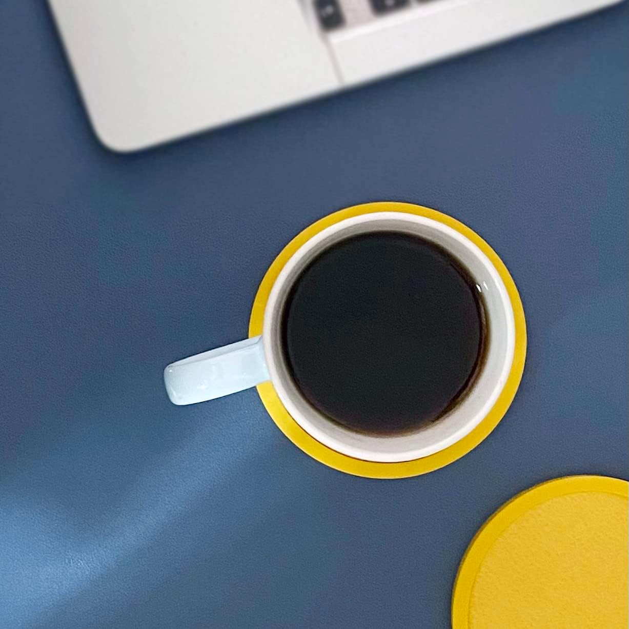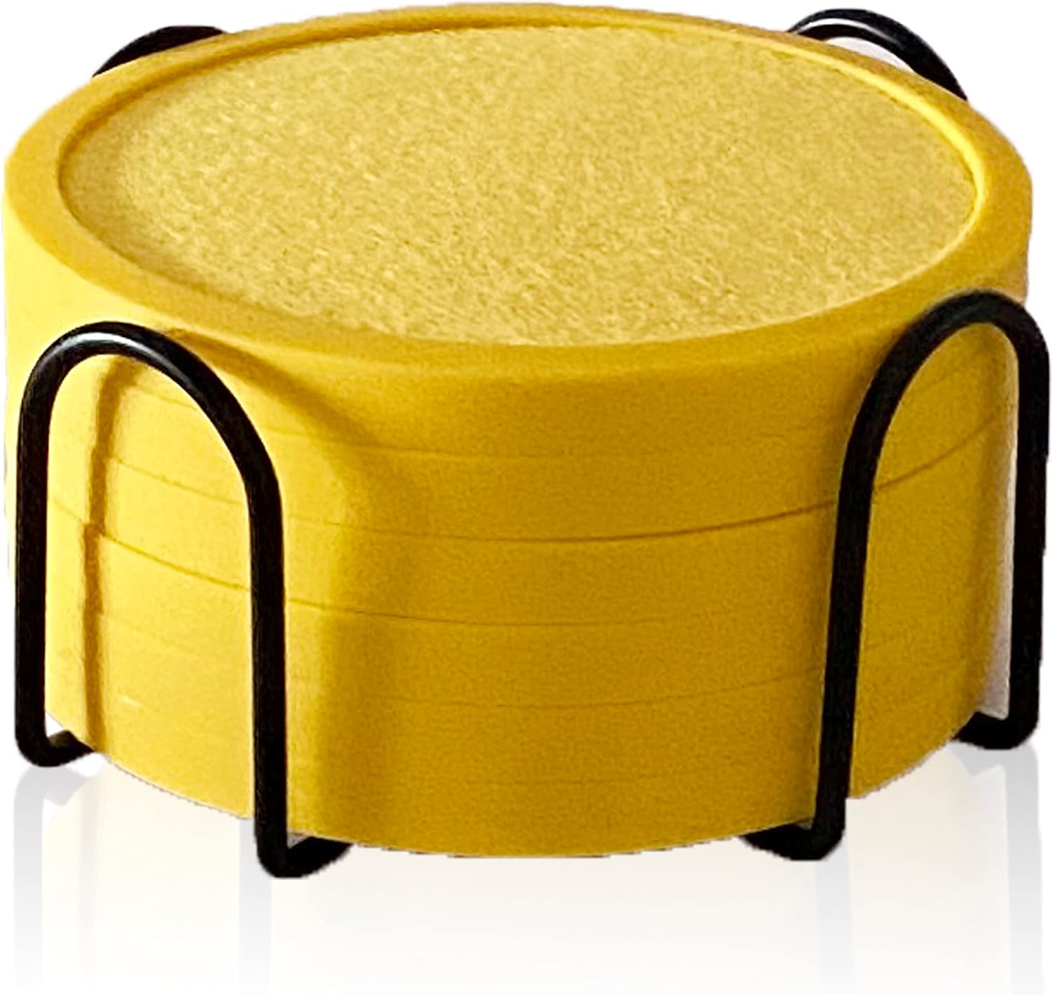 - What You Get: 6 non-slip silicone drink coasters(round, yellow, 4.3 inch), 6 absorbent felt inserts(round, yellow) and a 4.5-inch metal holder(black). The silicone coasters can be used alone, or with the inserts. Fits all types of bottles/cups/mugs/tumblers