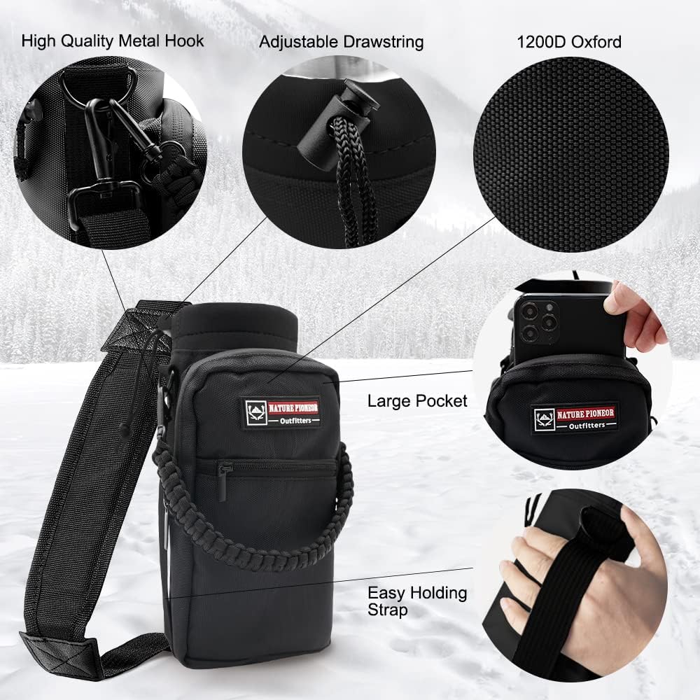 - 【Portable Water Bottle Holder】 – To make carrying easier, this water bottle comes with a handmade paracord handle and adjustable shoulder strap for hands-free convenience. The holder includes a zippered storage pocket for small items like keys, cards, or snacks, and a side hook for accessories. Whether you’re going on long hikes, outdoor adventures, or traveling, this bottle + carrier set offers both functionality and style