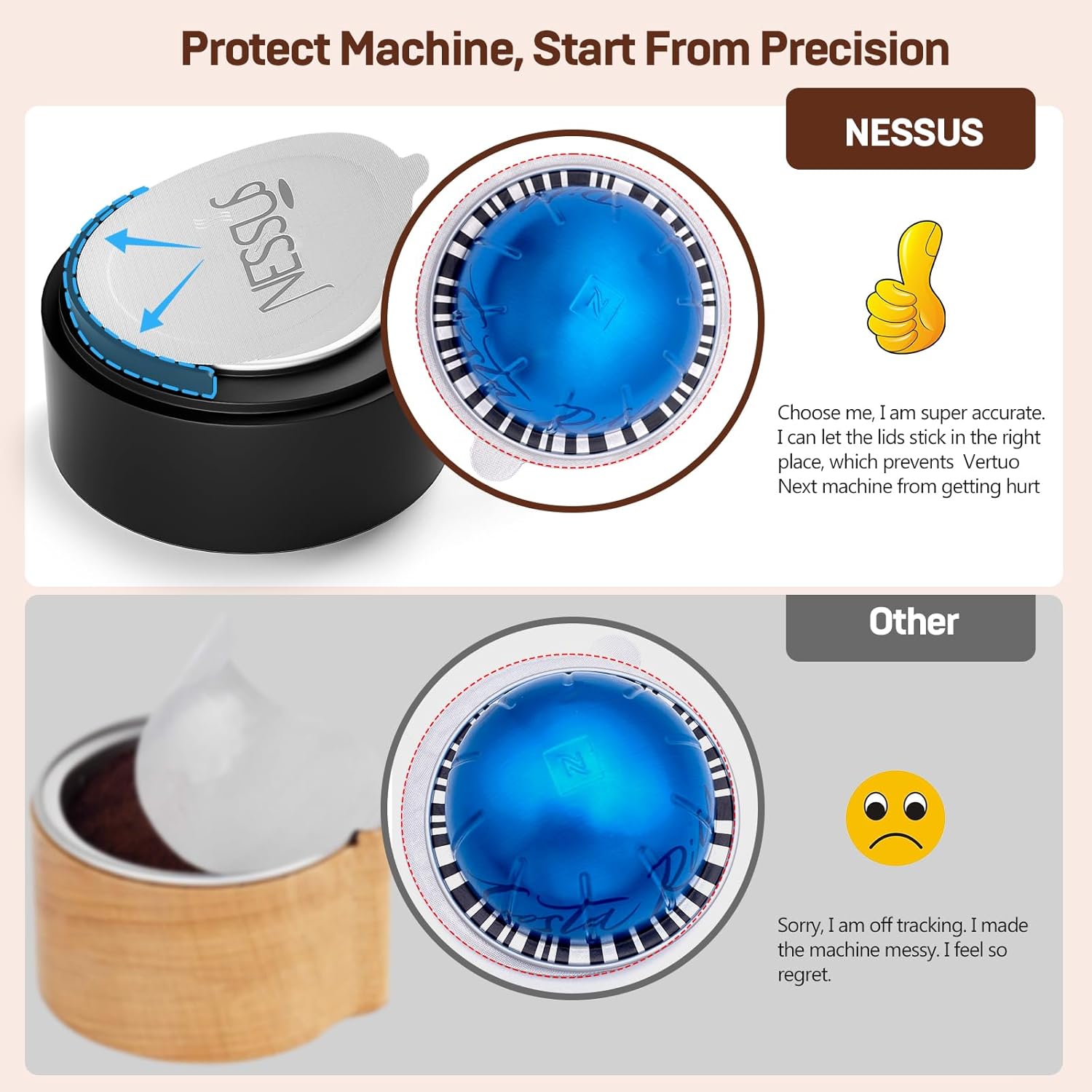 - Easy to Refill: Refilling your vertuo reusable pods with the NESSUS refillable pods kit is simple and hassle-free. Just put the empty capsule into the holder, add your favorite coffee powder, and use the NESSUS foils to align on the edge of the capsule. Then, press the top cover of the holder to get a new capsule.
