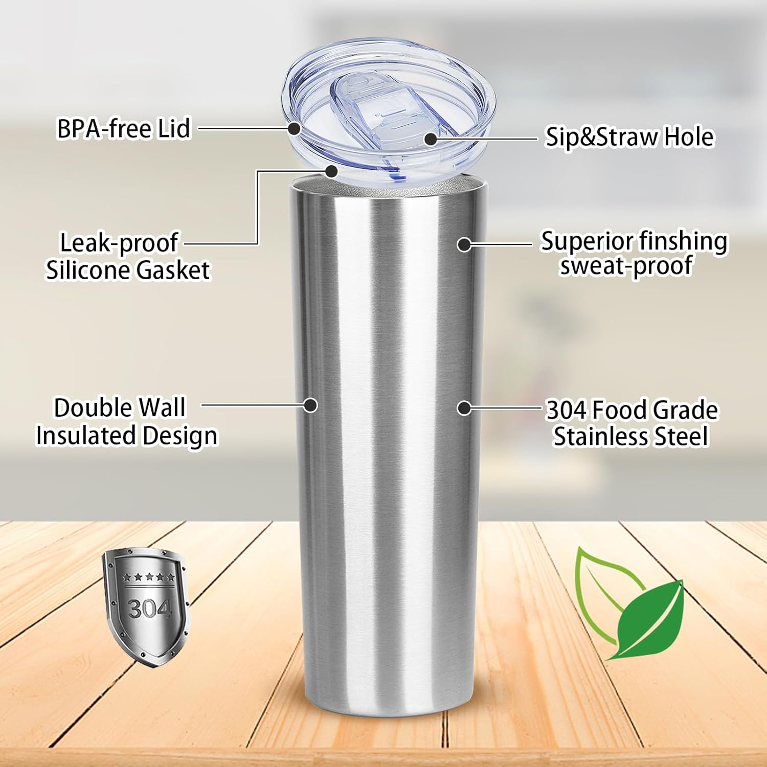 20 oz Skinny Tumbler with Lid and Straw,Stainless Steel Vacuum Insulated Tumbler Cup Double Wall Leak-proof Coffee Mug,Travel Thermal Water Tumbler for Office,Outdoor(Silver,1)