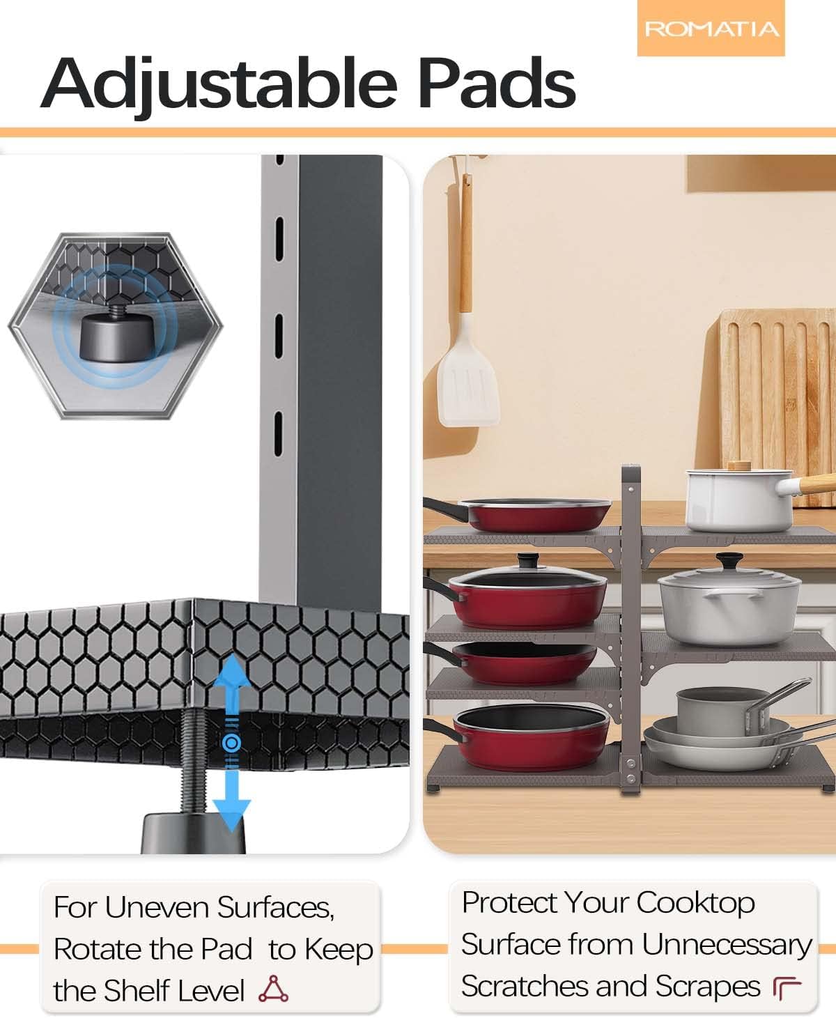 - [Adjustable Shelves] Customize each shelf position according to your pan and pot heights. You can quickly get out a heavy iron skillet from the shelf. Fit all sizes of pot pans. You can get to exactly the ones you want without rifling through a whole mountain. Also a good pot lid organizer for cabinet.