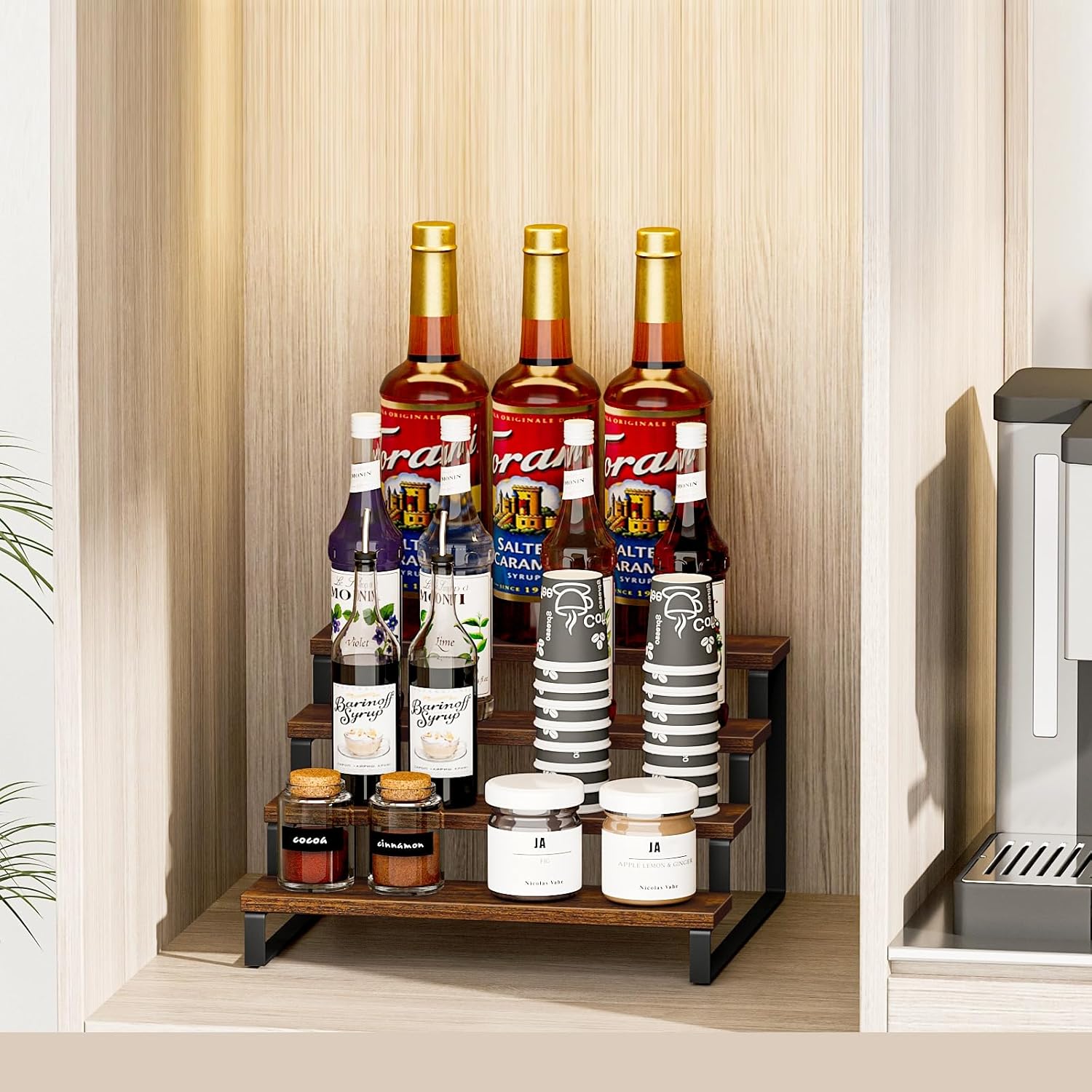 - 【Space-Saving Design】The size of this spice organizer: 13.8”L x 12.5”W x 8.3”H. The stepped design allows your spice bottles, jars, coffee syrup bottles, condiments and spices to be clearly classified and fully displayed, you can find them quickly when you need them while cooking, avoiding panic.