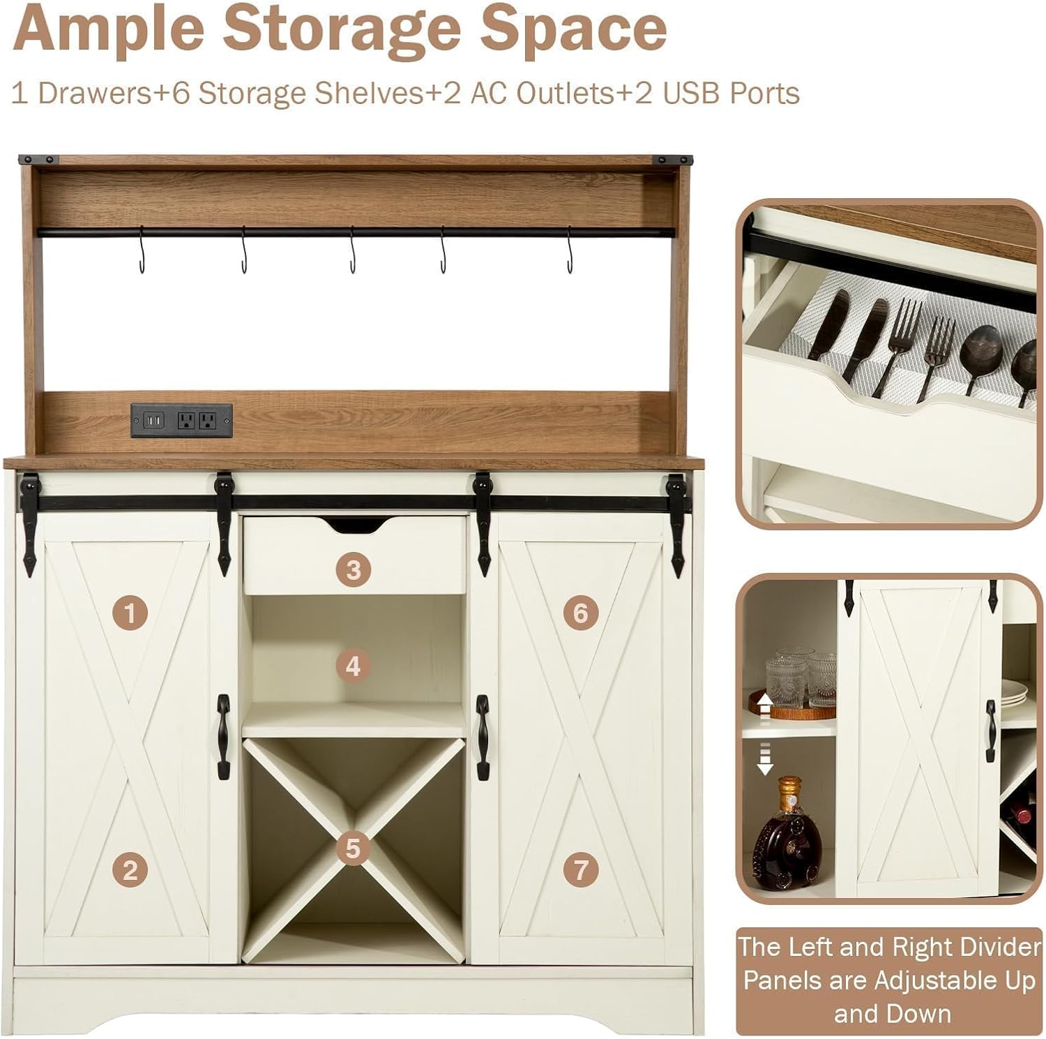 Wnutrees Farmhouse Coffee Bar Cabinet with Charging Station and USB Ports, Sliding Barn Door, 43" Kitchen Hutch Sideboard Buffet Storage Cabinet, Fits Kitchen Dining Living Room, White