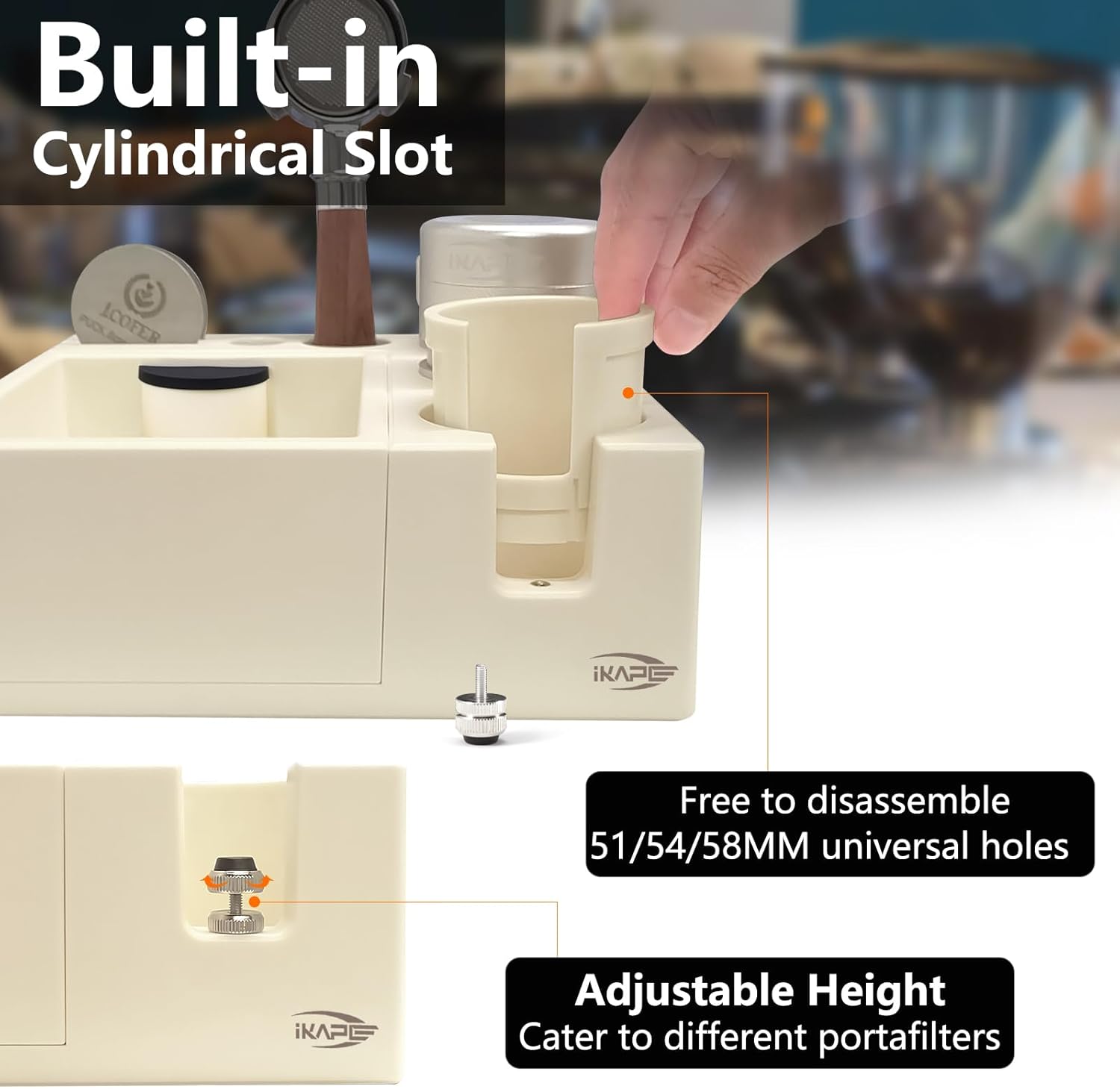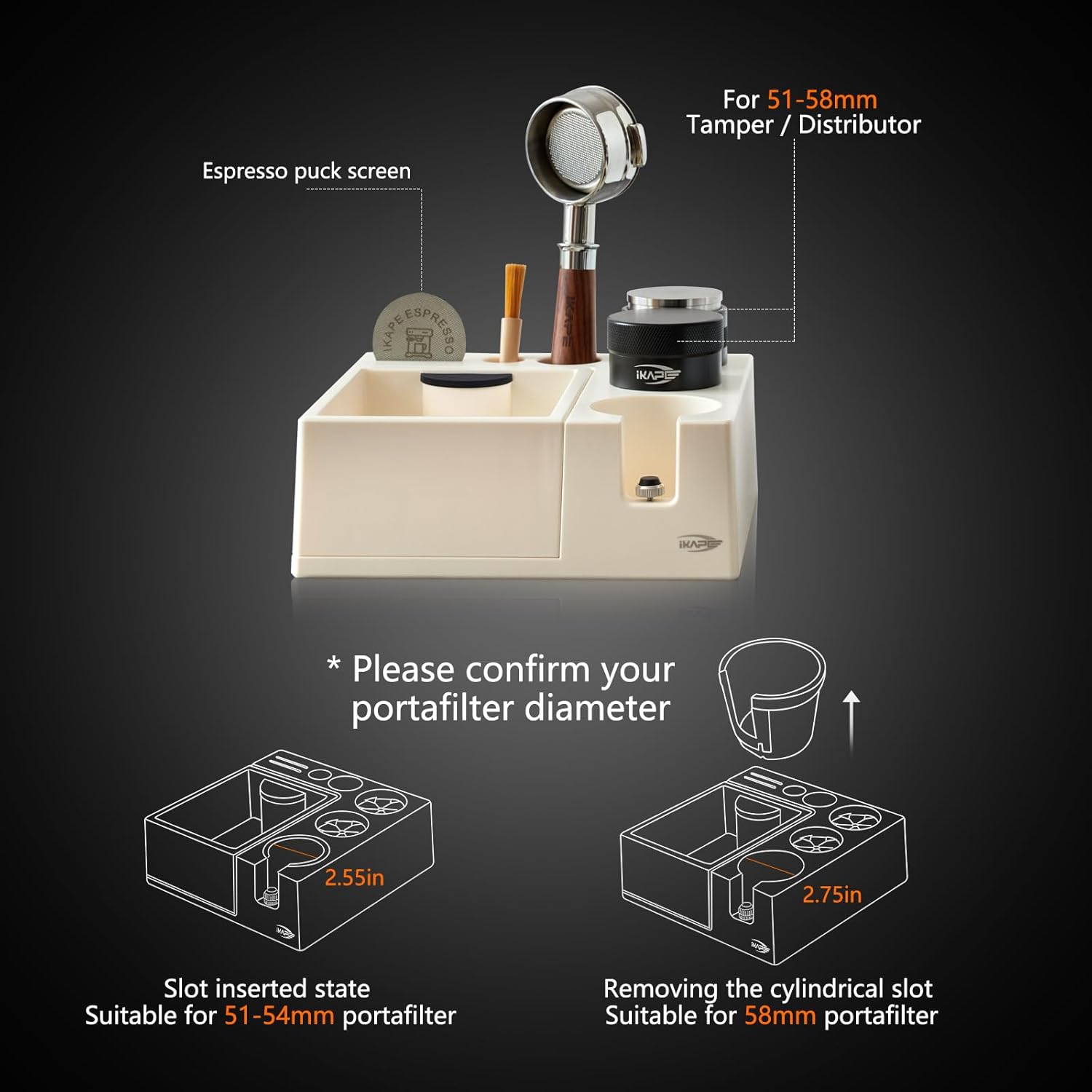 IKAPE Espresso Knock Box, Espresso Coffee Organizer Box Fit for Storage 51, 54, 58MM Espresso Tamper, Distributor, Portafilter & Puck Screen Accessories, Plastic Station Base(White)