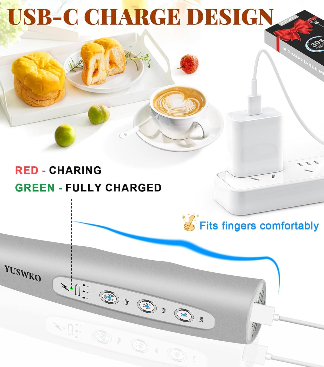 YUSWKO Milk Frother Handheld for Coffee, Rechargeable Drink Mixer with 3 Heads 3 Speeds Electric Coffee Frother Whisk, Gift for Many Occasions and Festival