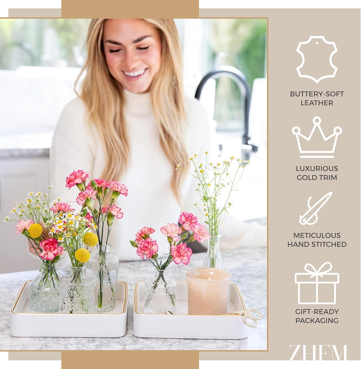 - ๐ Melds with Your Interior Decor: Offered in timeless white and gray colors, our dump tray embraces versatility; This decorative vanity tray for nightstand, sleek gold trim desk organizer, stylish vanity trays for bedroom dresser, and elegant tray for dresser top will slip effortlessly into your existing home, adding a touch of refinement that complements your style. Whenever you consider upgrading your bedside decor, a decorative vanity tray, keys tray, or tray for keys, ZHEM brand is an excellent choice for you.